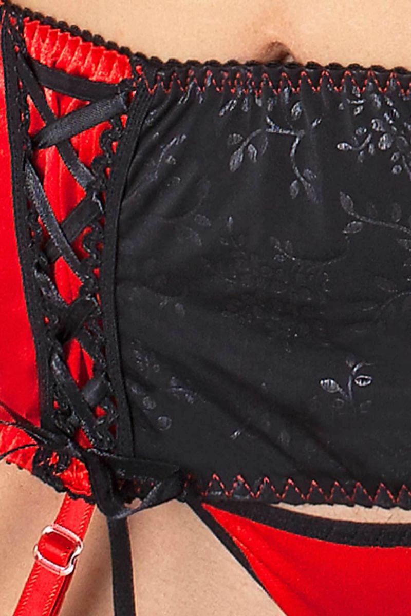Этот элегантный комплект нижнего белья создан для тех, кто ценит чувственность и внимание к деталям. Сочетание насыщенного черного цвета с яркими красными акцентами создает эффектный контраст, подчеркивающий женственность и уверенность. Декоративные шнуровки добавляют образу игривости и загадочности, превращая обычное белье в настоящее произведение искусства.