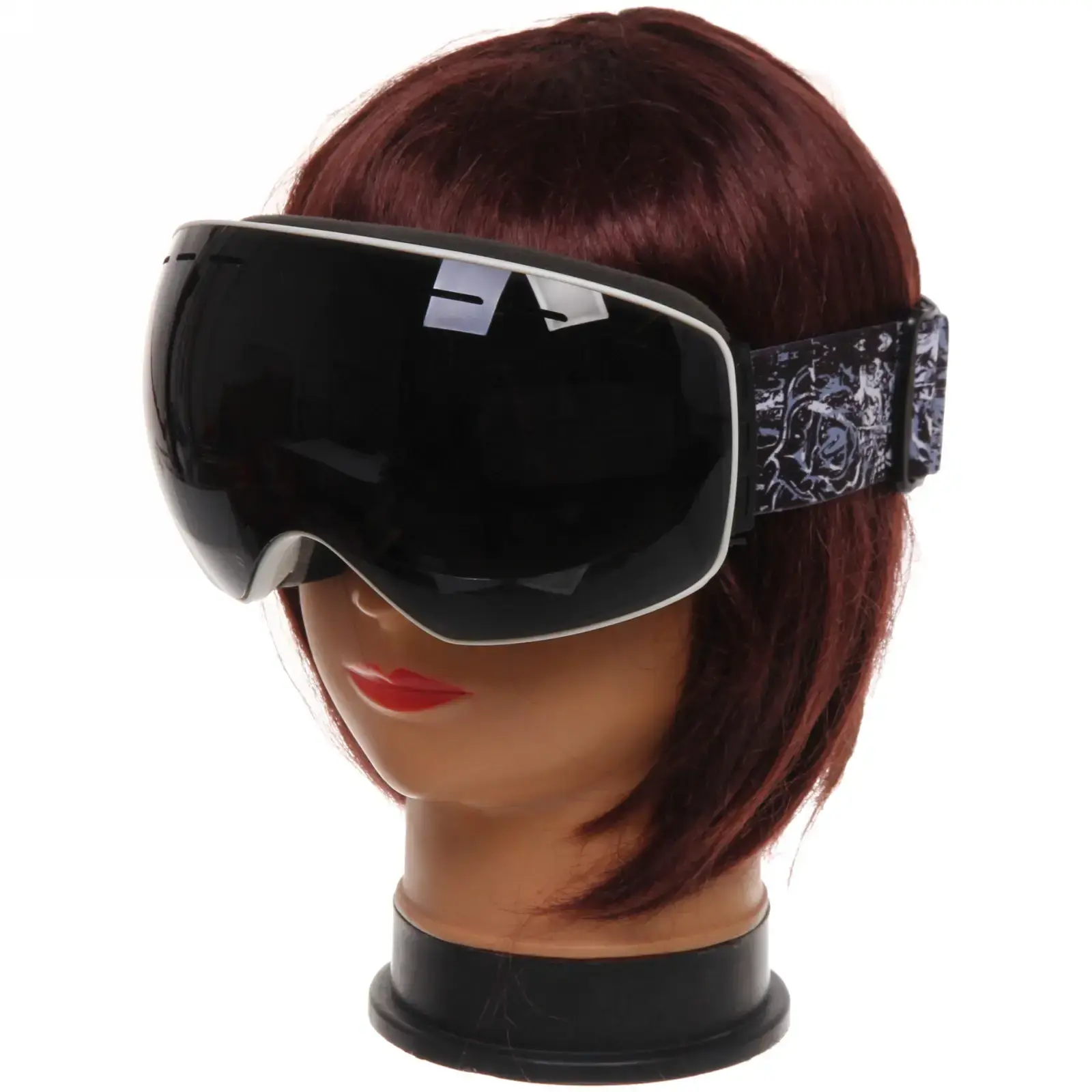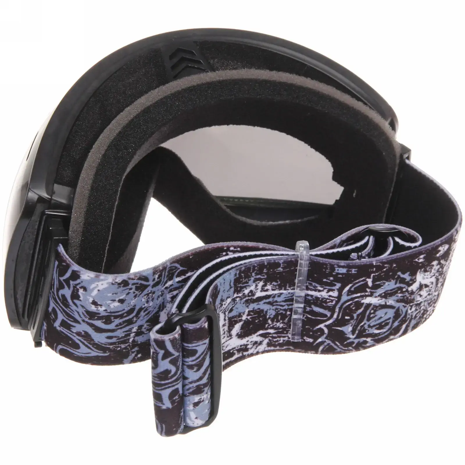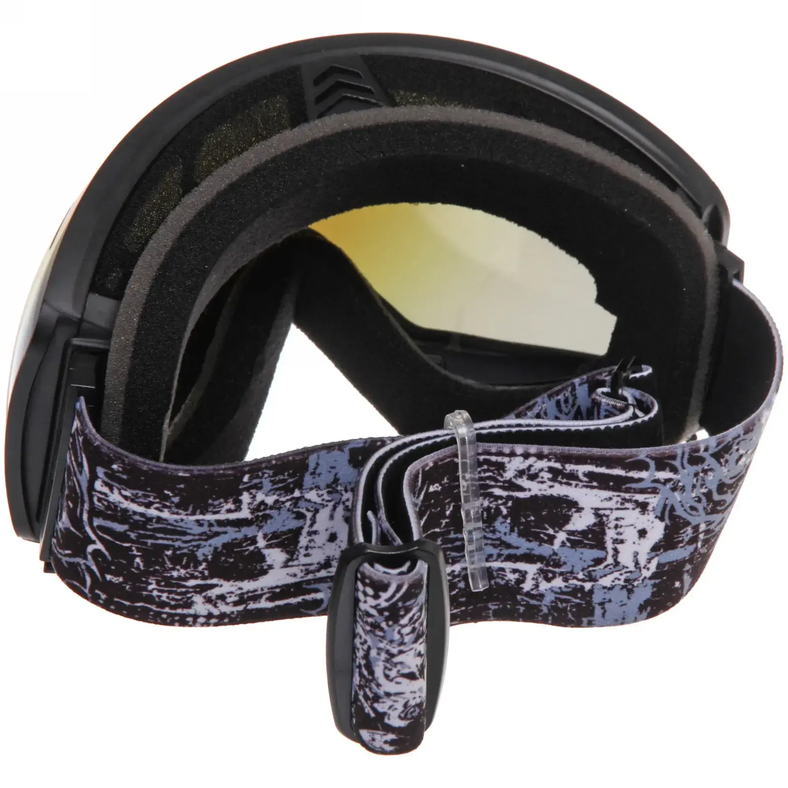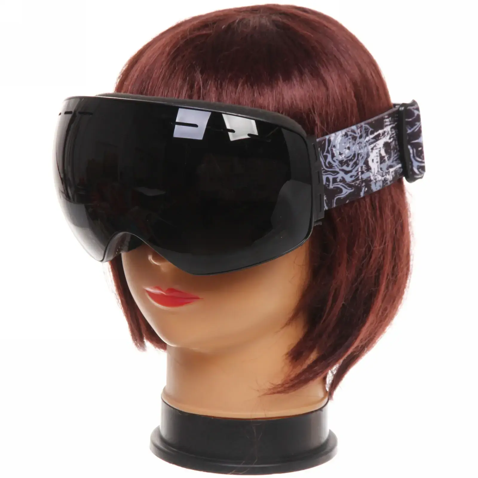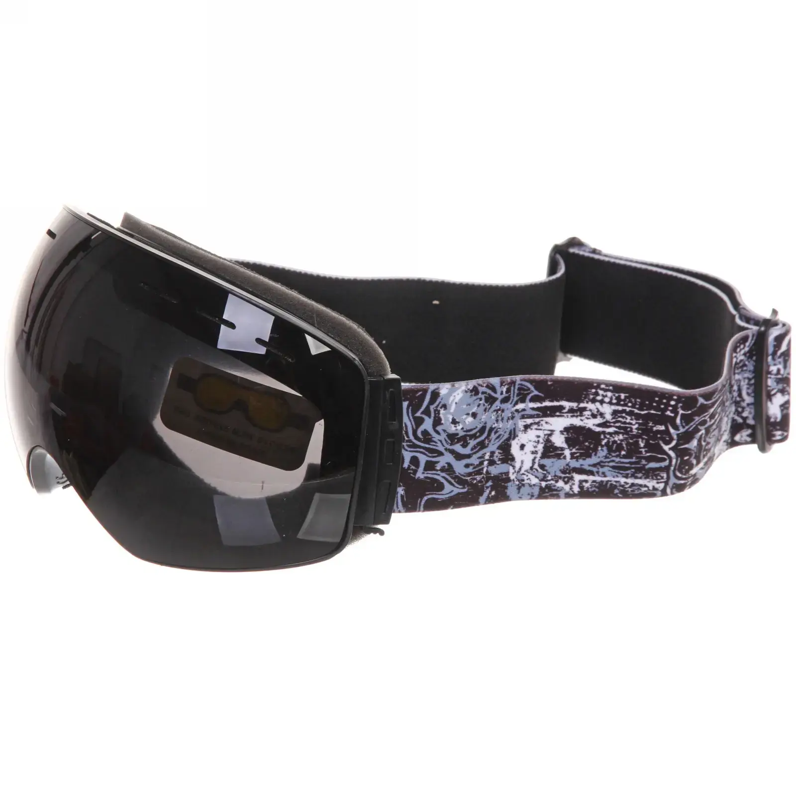 Очки имеют черную пластиковую рамку и широкий эластичный ремешок с графическим узором, который надежно фиксирует их на голове. Размеры очков стандартные, что позволяет им подходить большинству пользователей. Эти очки идеально подходят для использования в условиях яркого солнечного света и снежных склонах, обеспечивая защиту и комфорт.