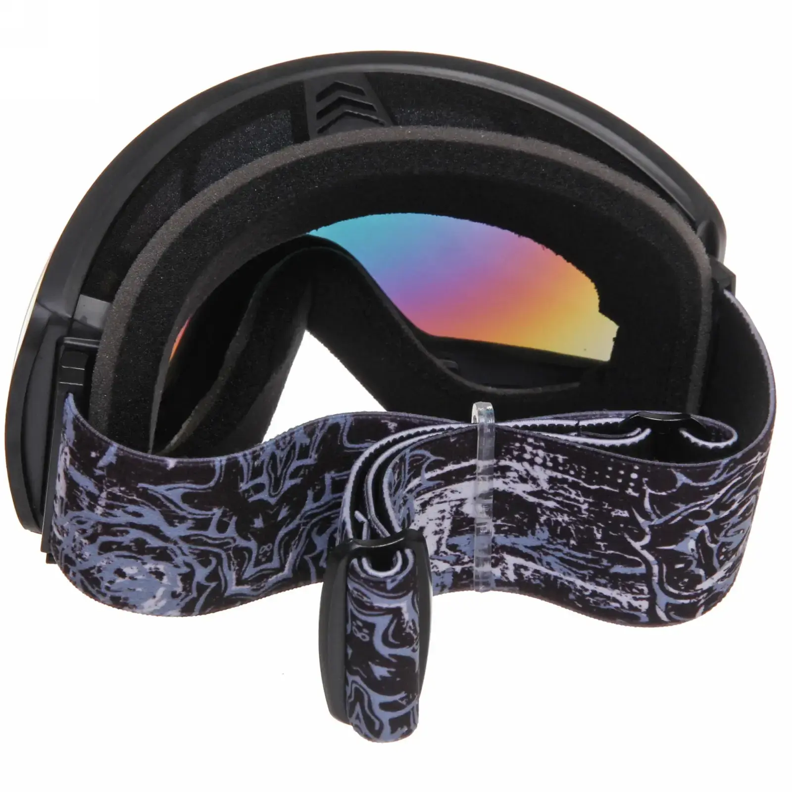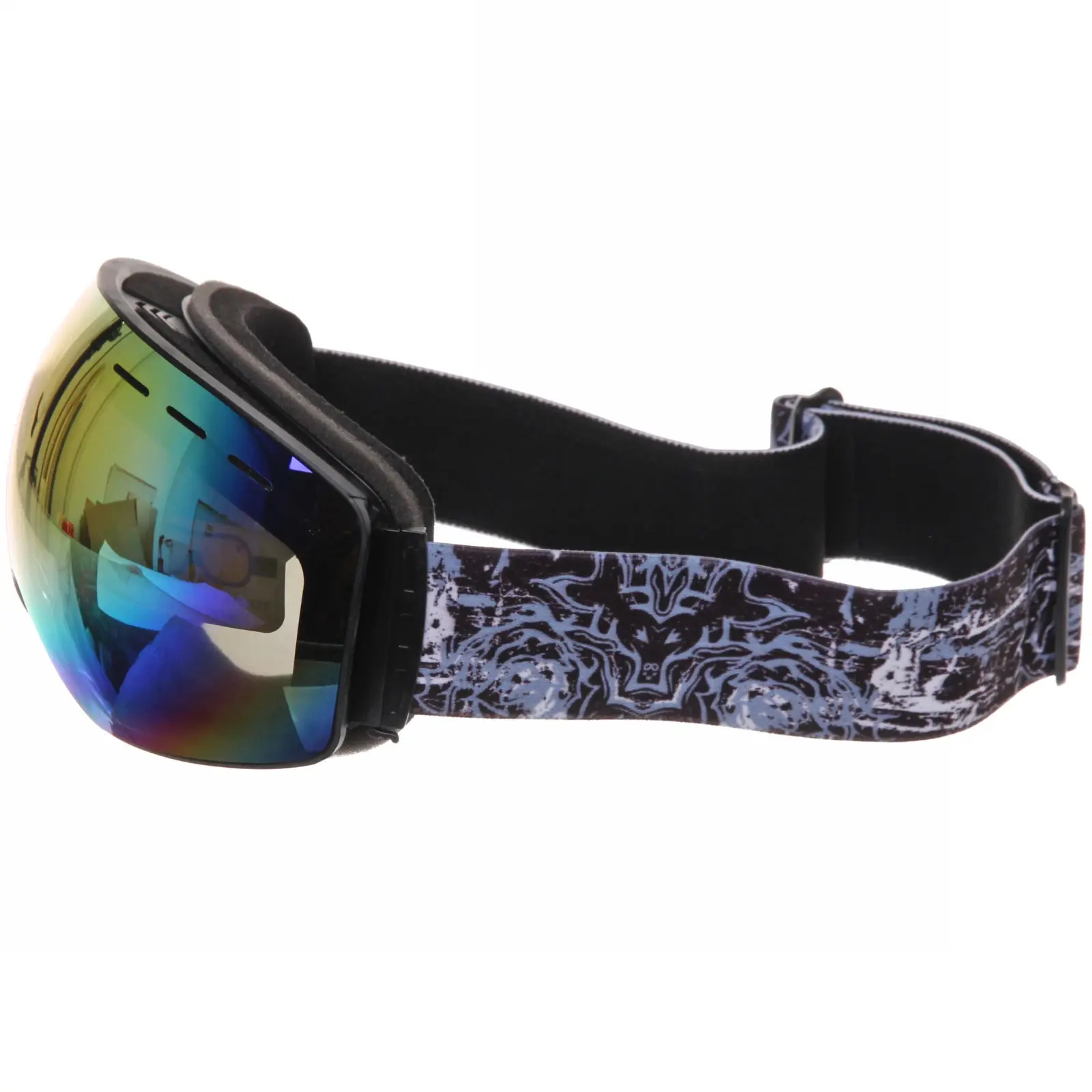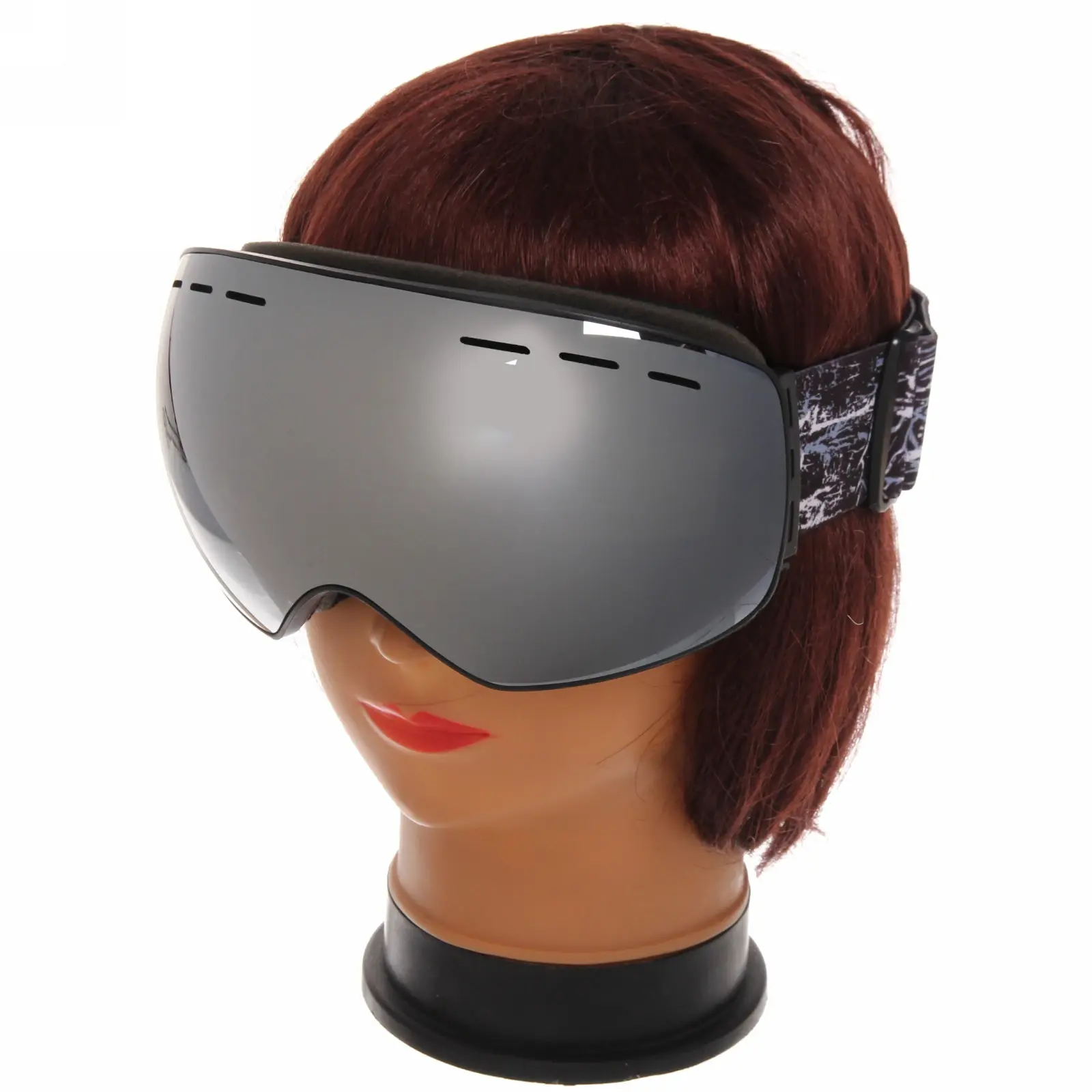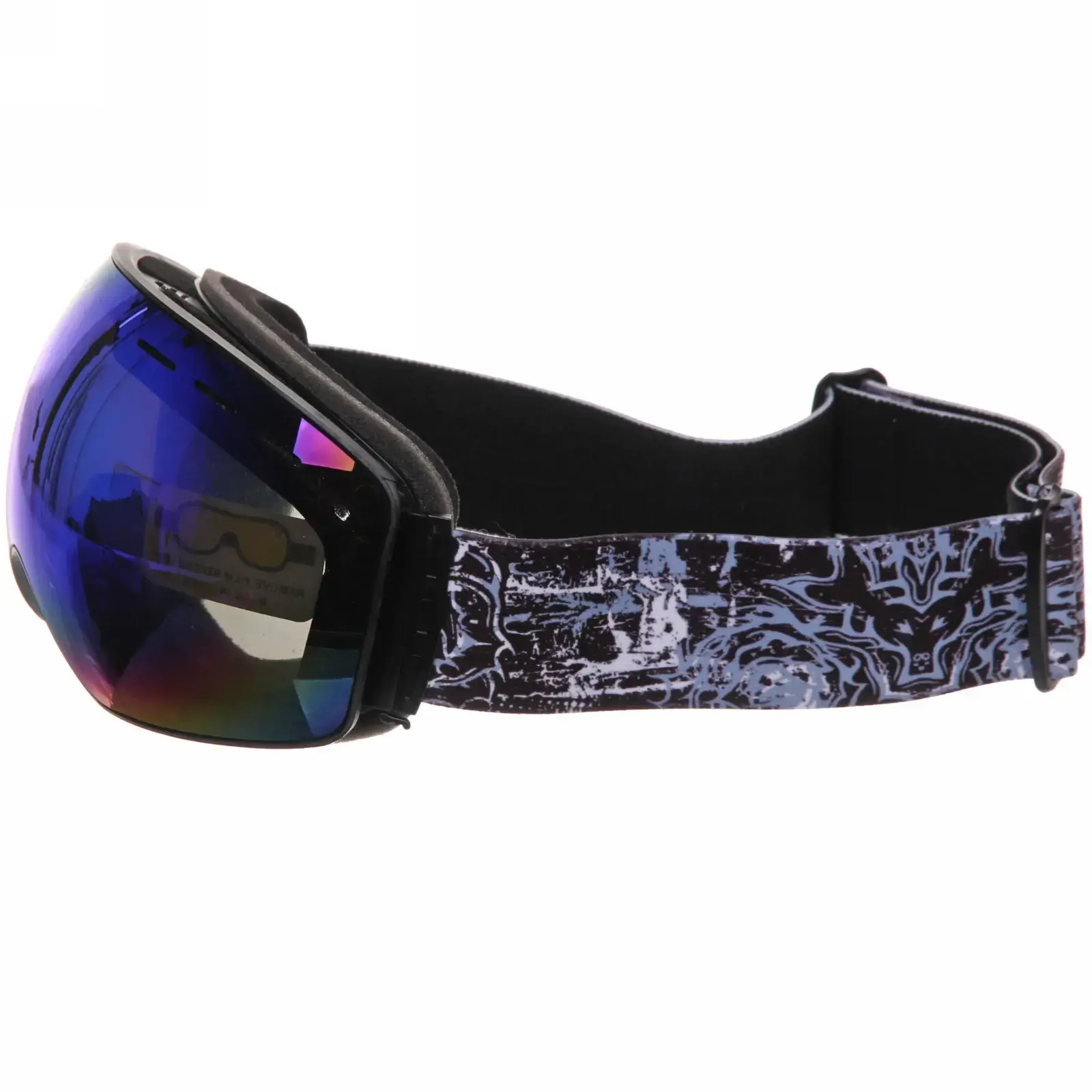 Очки имеют черную пластиковую рамку и широкий эластичный ремешок с графическим узором, который надежно фиксирует их на голове. Размеры очков стандартные, что позволяет им подходить большинству пользователей. Эти очки идеально подходят для использования в условиях яркого солнечного света и снежных склонах, обеспечивая защиту и комфорт.