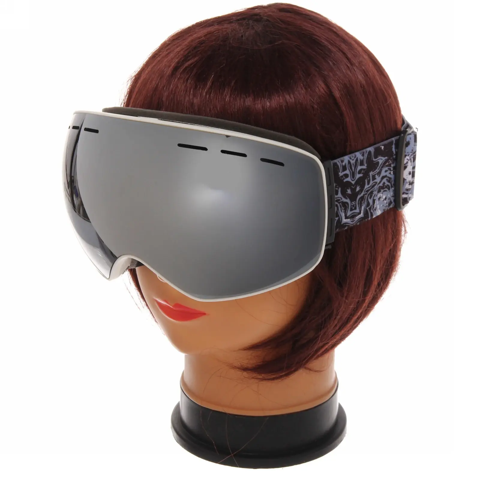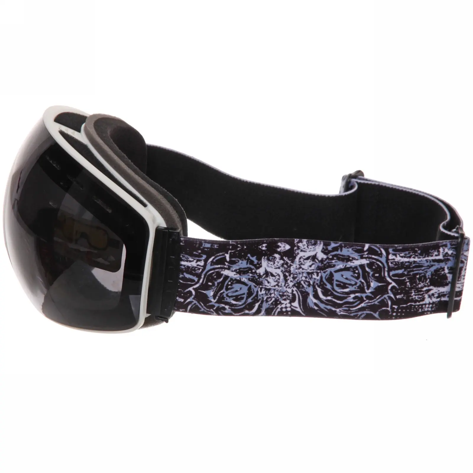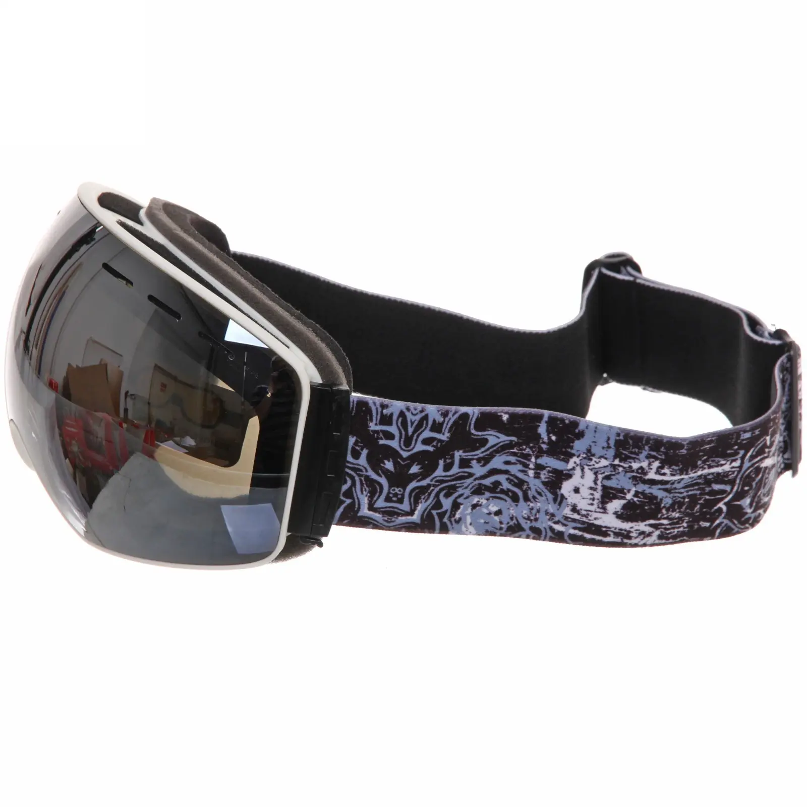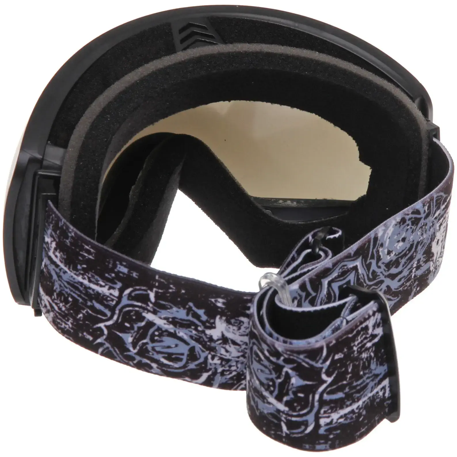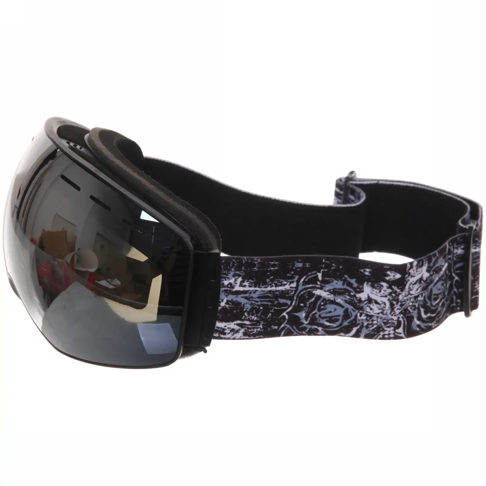 Очки имеют черную пластиковую рамку и широкий эластичный ремешок с графическим узором, который надежно фиксирует их на голове. Размеры очков стандартные, что позволяет им подходить большинству пользователей. Эти очки идеально подходят для использования в условиях яркого солнечного света и снежных склонах, обеспечивая защиту и комфорт.