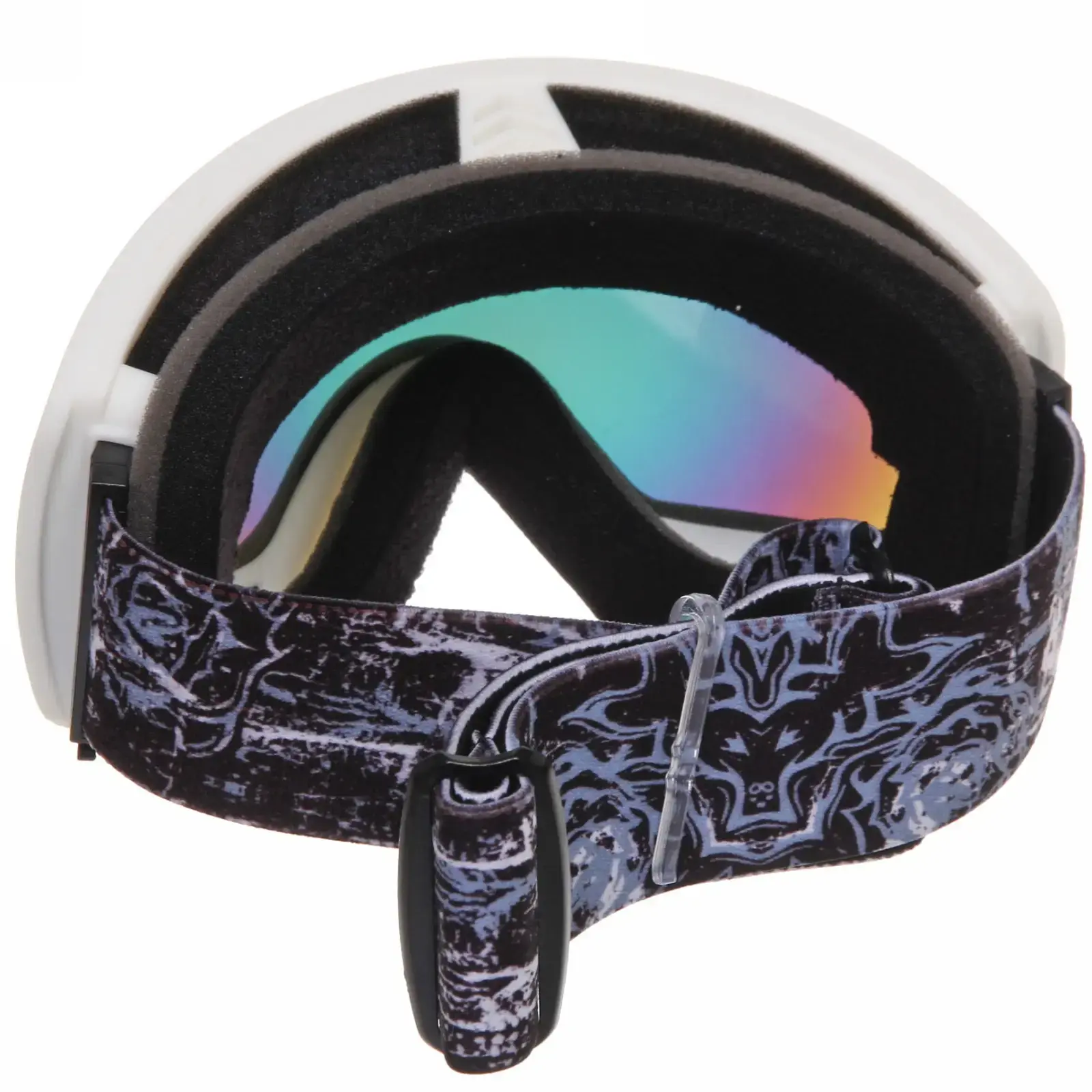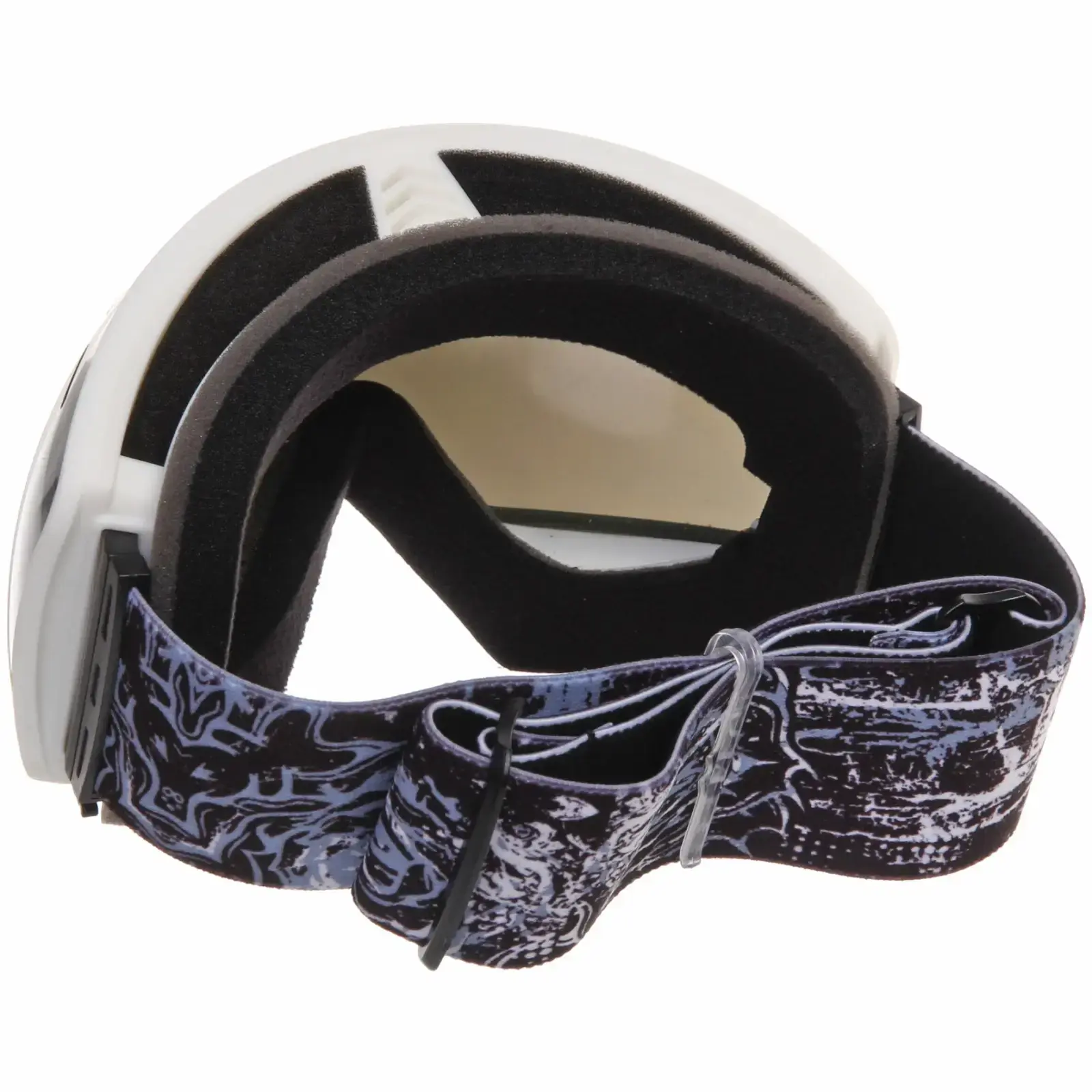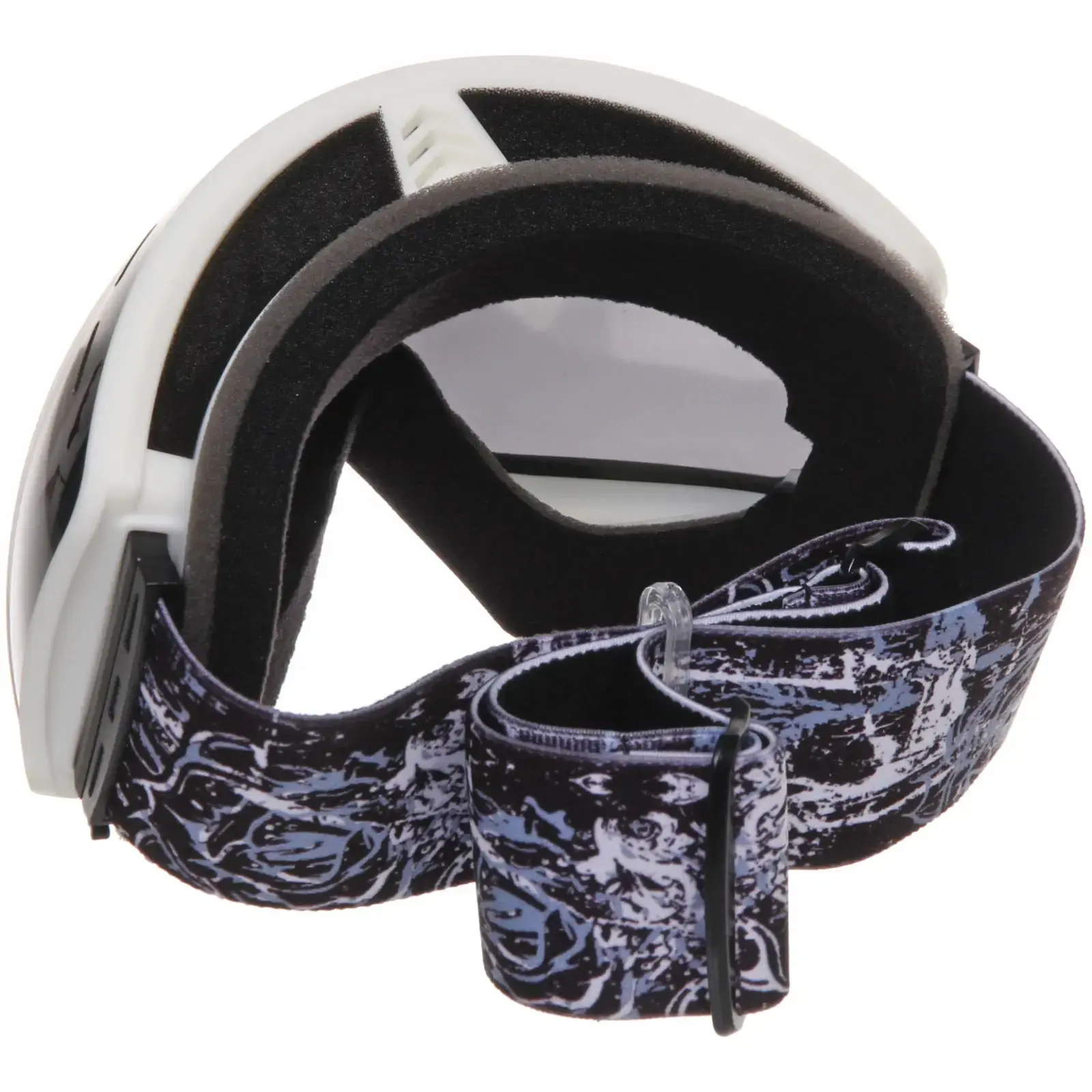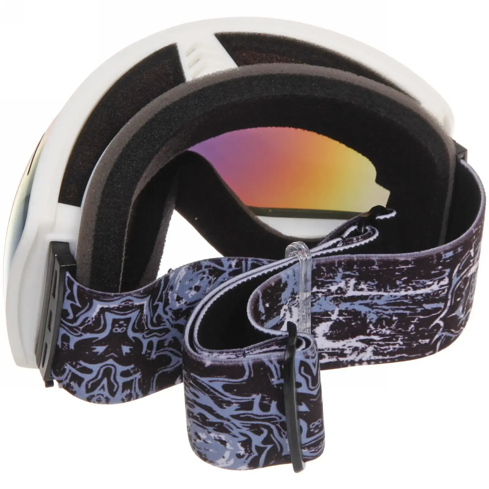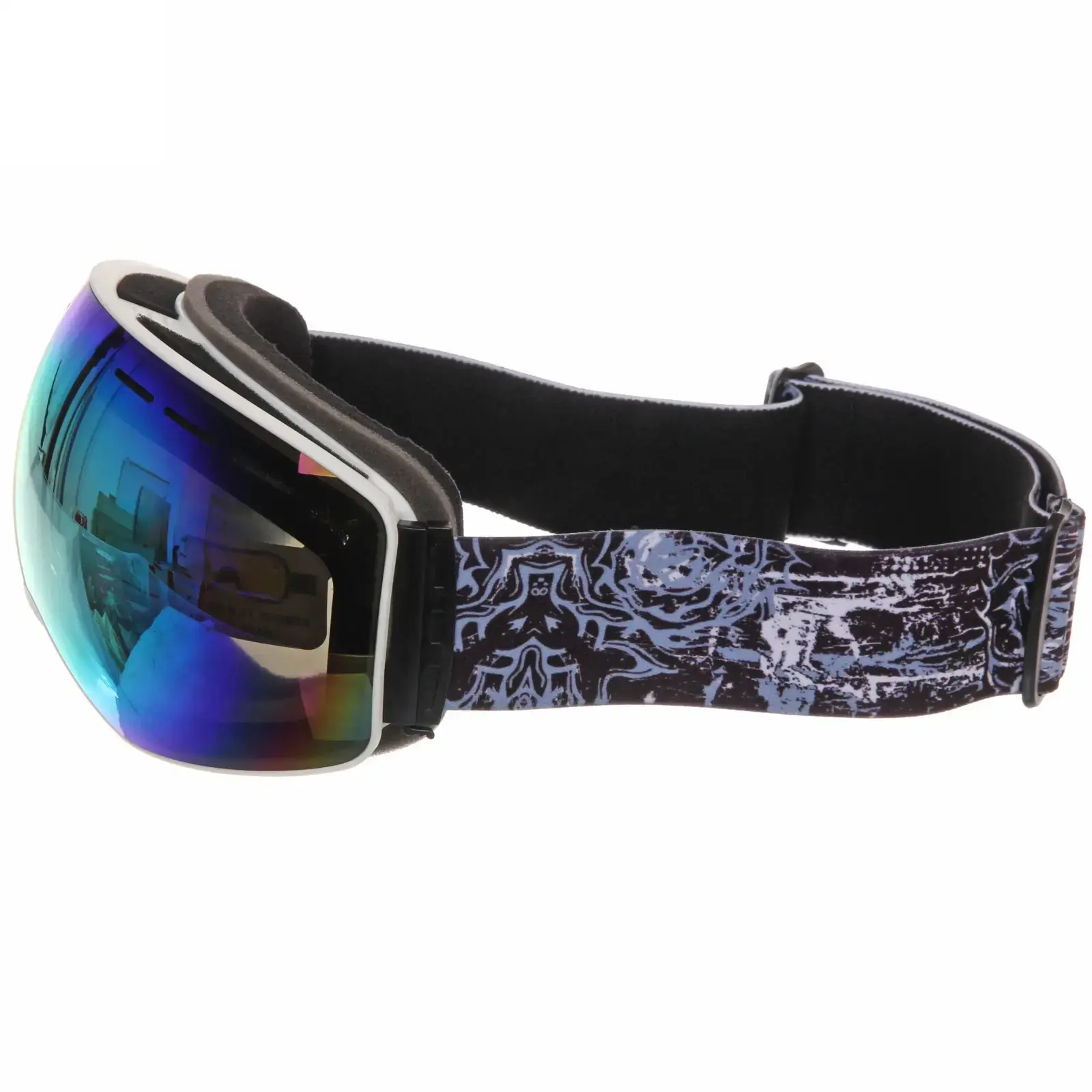Очки имеют черную пластиковую рамку и широкий эластичный ремешок с графическим узором, который надежно фиксирует их на голове. Размеры очков стандартные, что позволяет им подходить большинству пользователей. Эти очки идеально подходят для использования в условиях яркого солнечного света и снежных склонах, обеспечивая защиту и комфорт.