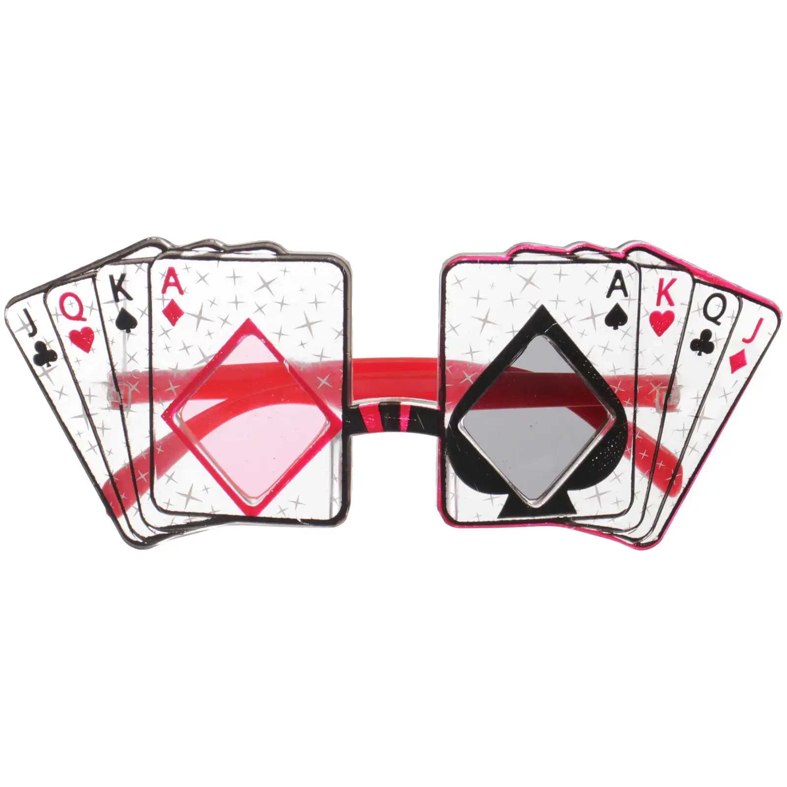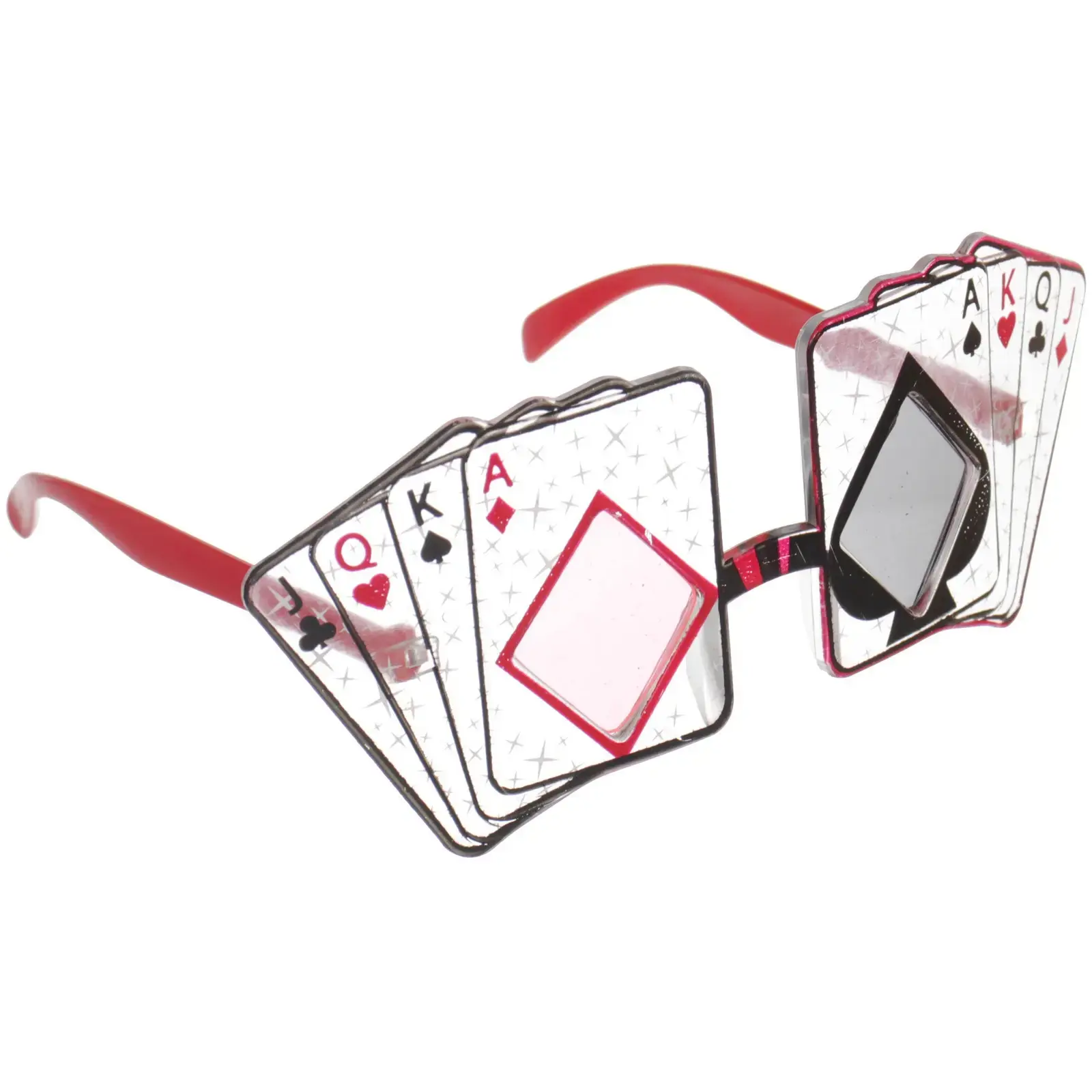 Размер очков составляет 18,2 см в ширину и 7,5 см в высоту, что делает их подходящими для большинства лиц. Основной цвет — прозрачный с красными дужками и черными элементами, что придает им стильный и современный вид. Эти очки идеально подойдут для использования на различных мероприятиях, связанных с азартными играми, карнавальными праздниками или просто для создания веселого образа.