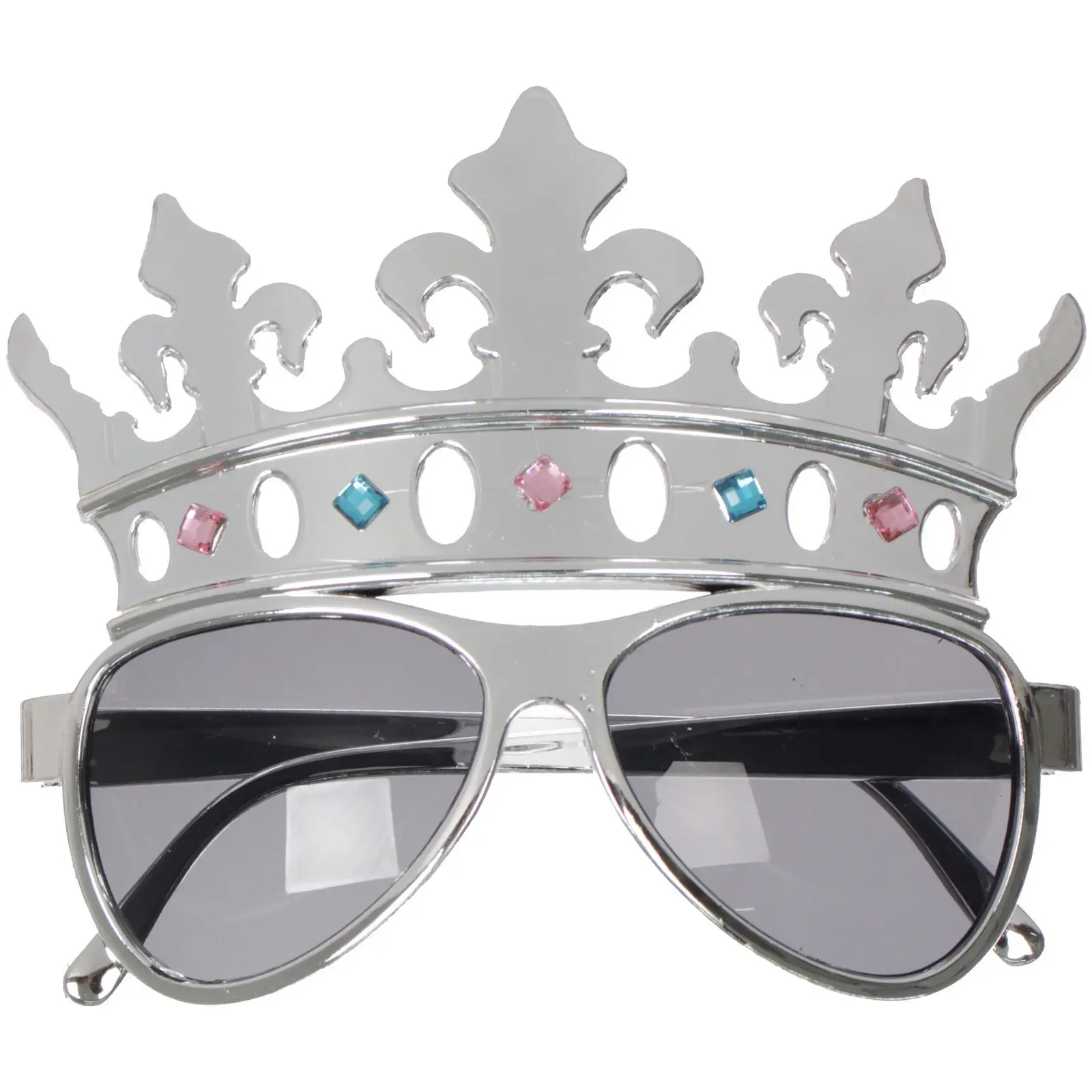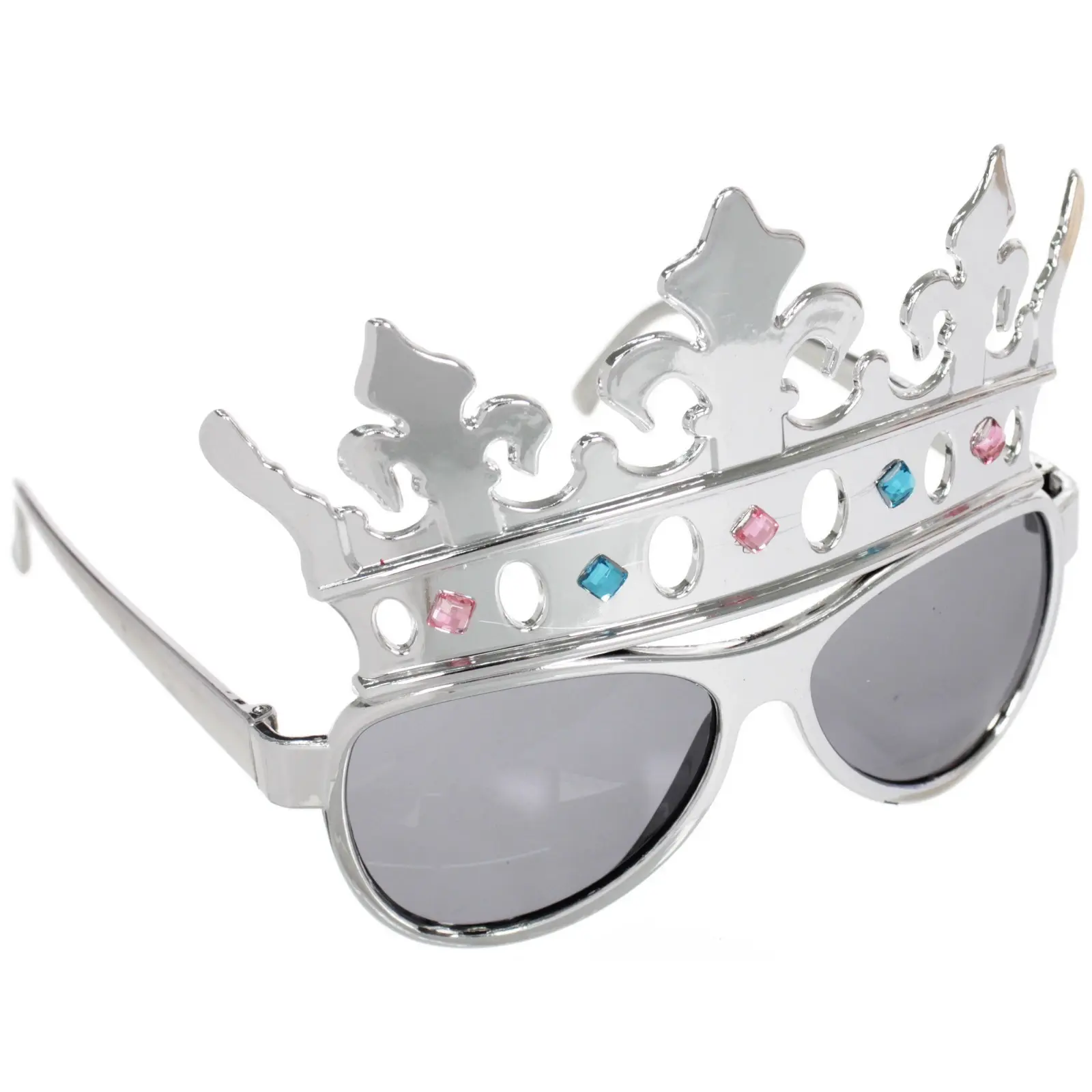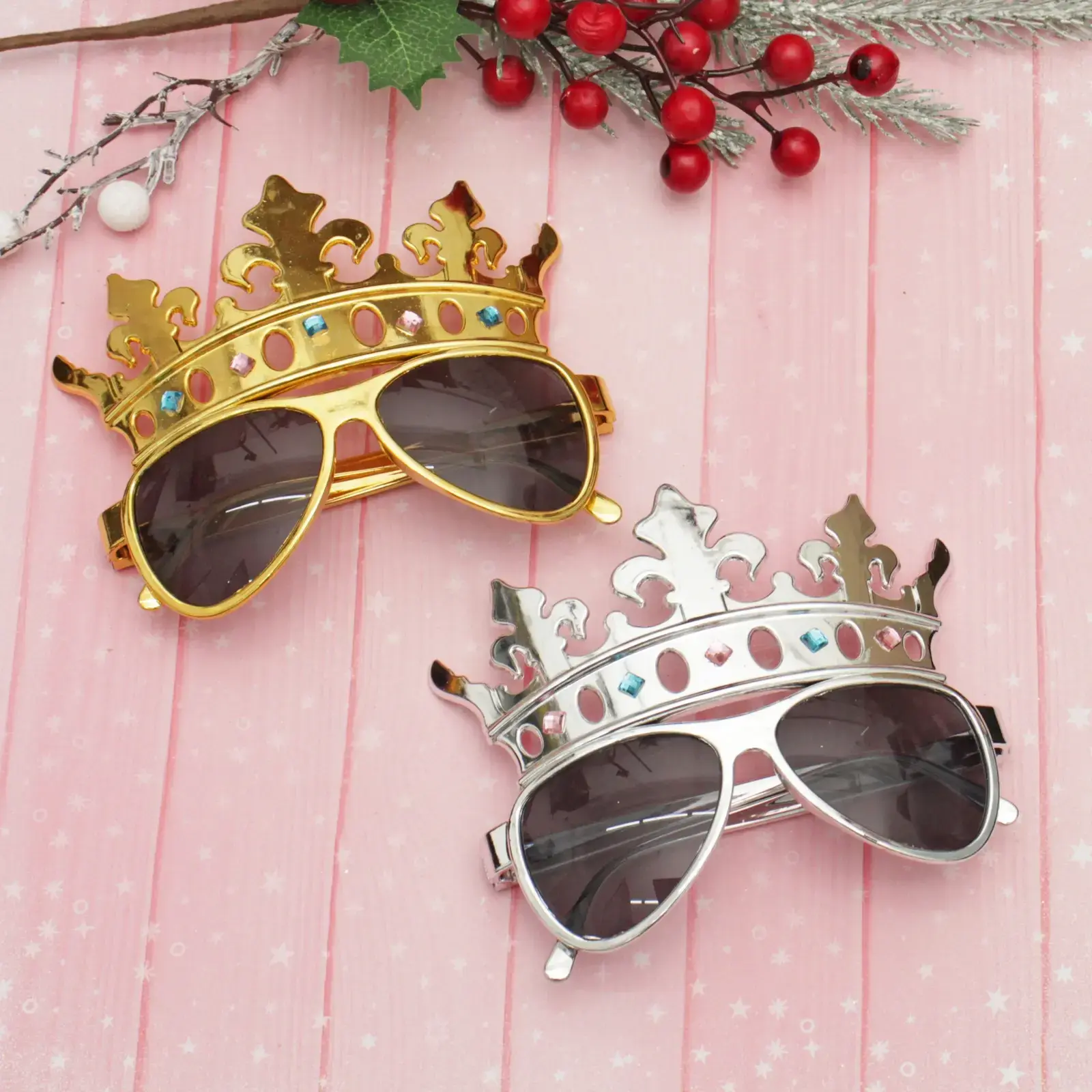 Очки имеют затемненные линзы, что обеспечивает защиту от солнечных лучей, а также добавляет загадочности вашему образу. Корона, оформленная с использованием цветных камней, придаёт очкам особый шарм. Эти очки — отличный выбор для создания незабываемого образа на любом празднике!