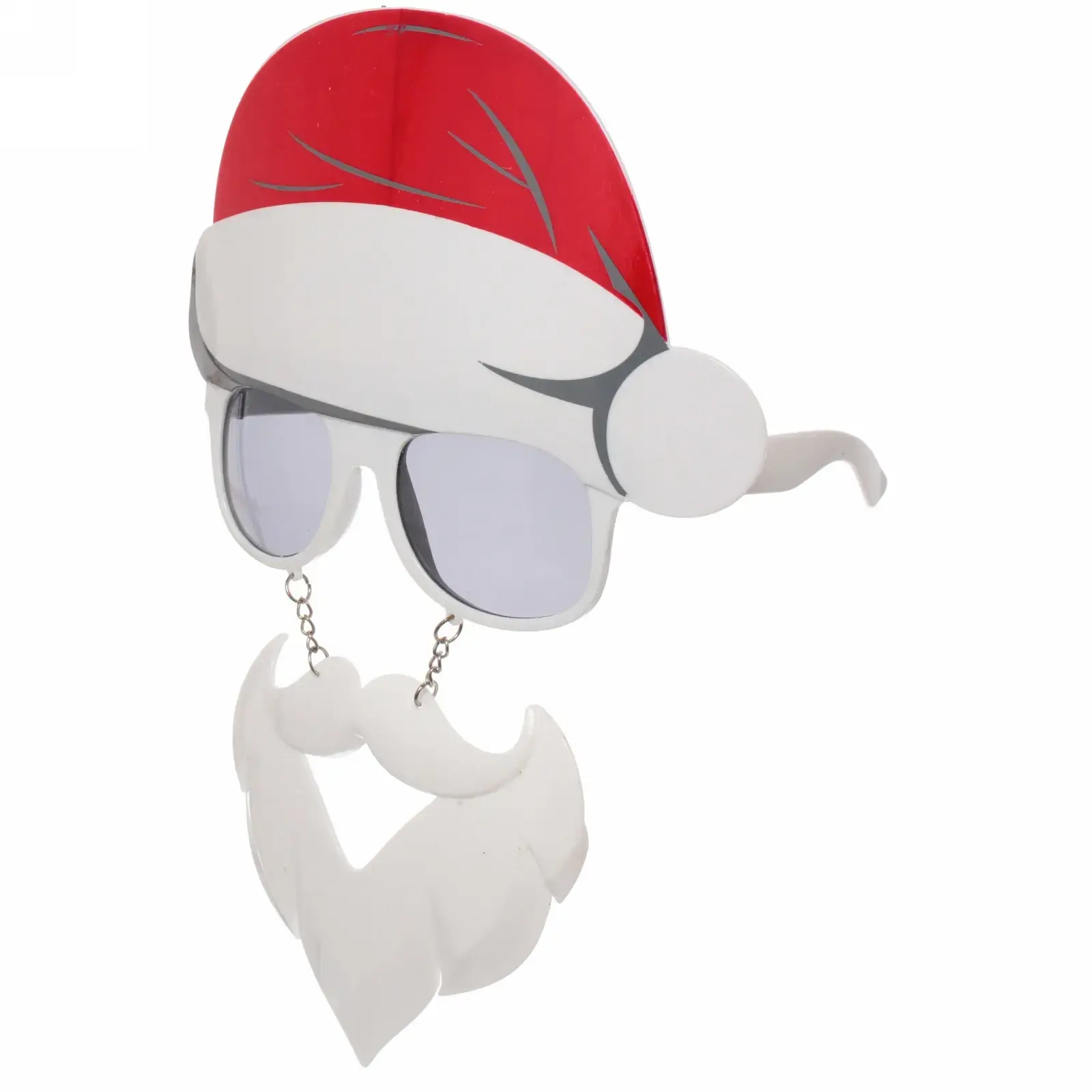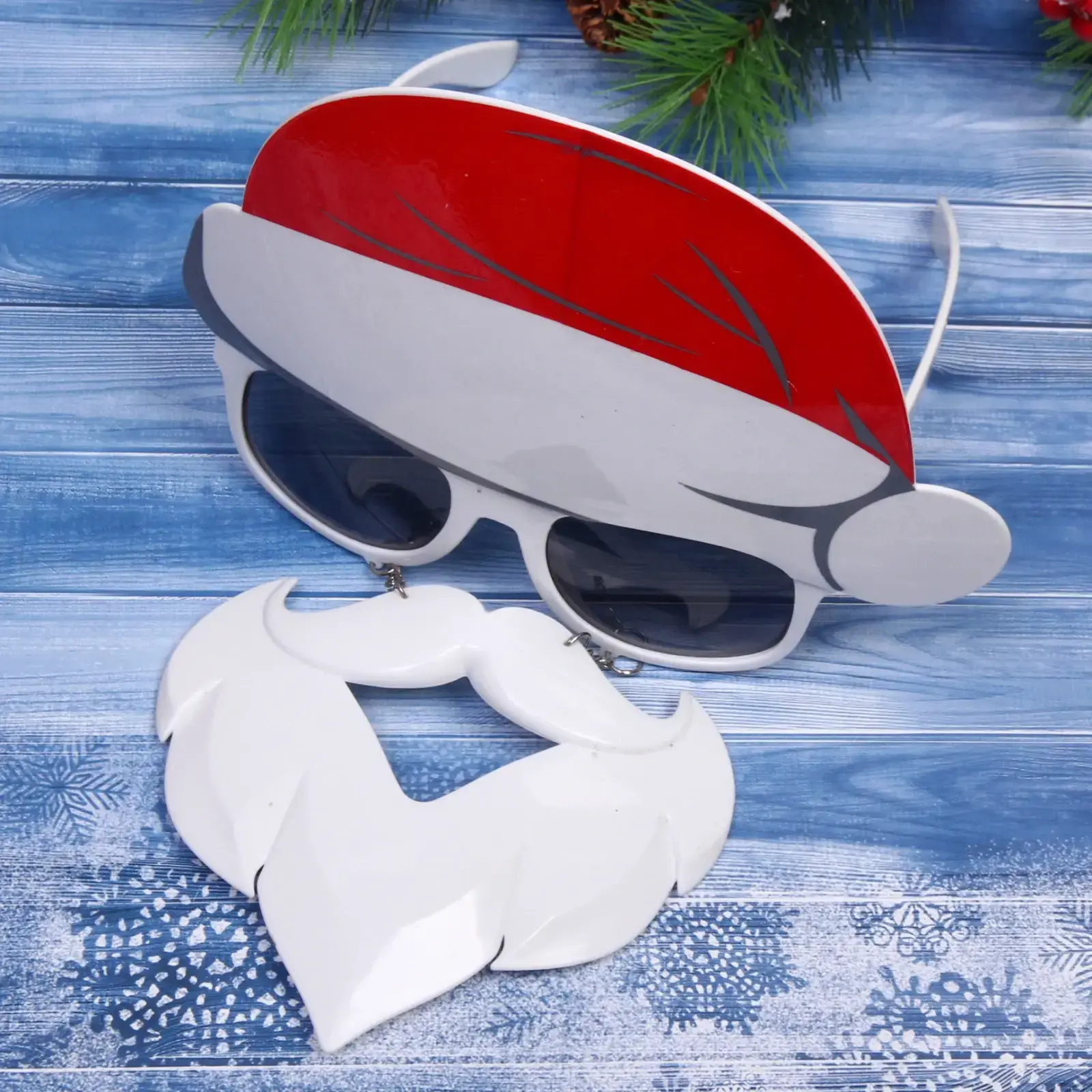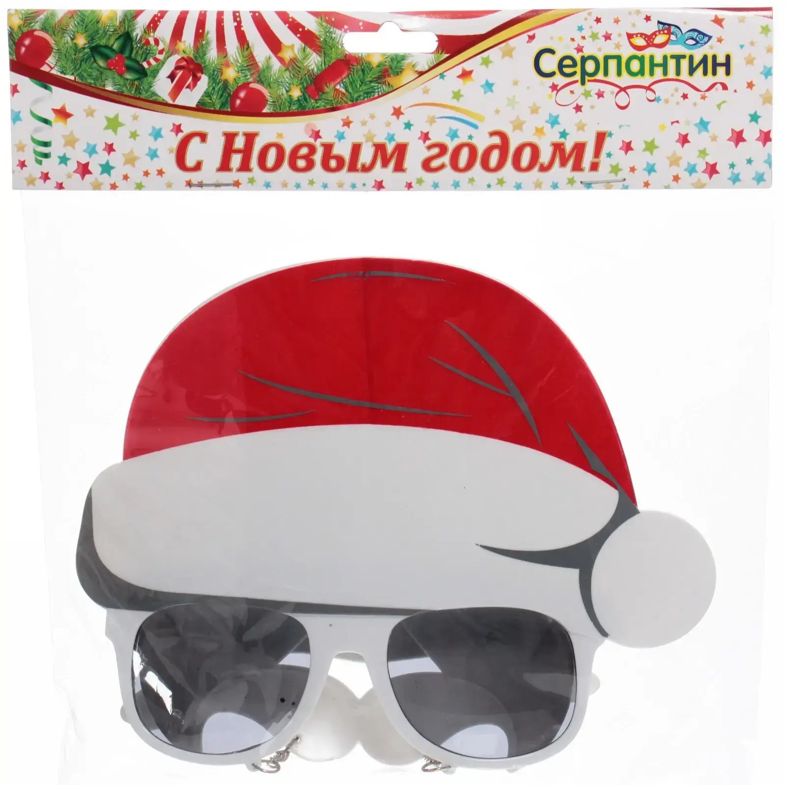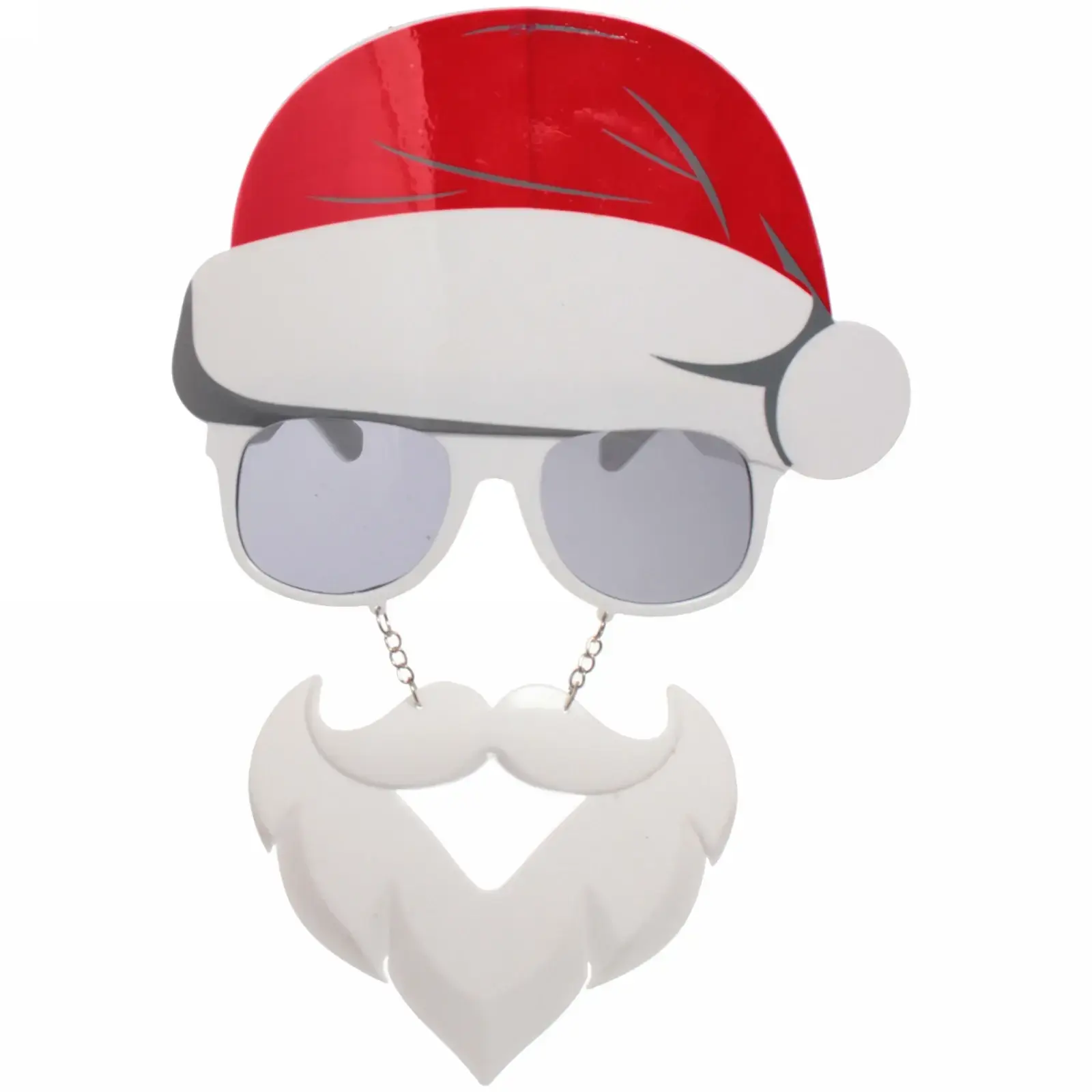Очки выполнены в стиле Санта-Клауса и имеют белую пластиковую рамку с серыми стеклами. Верхняя часть оформлена в виде красной шапки с белым помпоном, а под очками расположена белая борода, что создает эффект праздничного костюма. Эти очки легко носить благодаря легкому материалу и удобной конструкции, что делает их идеальными для длительного использования на праздниках.