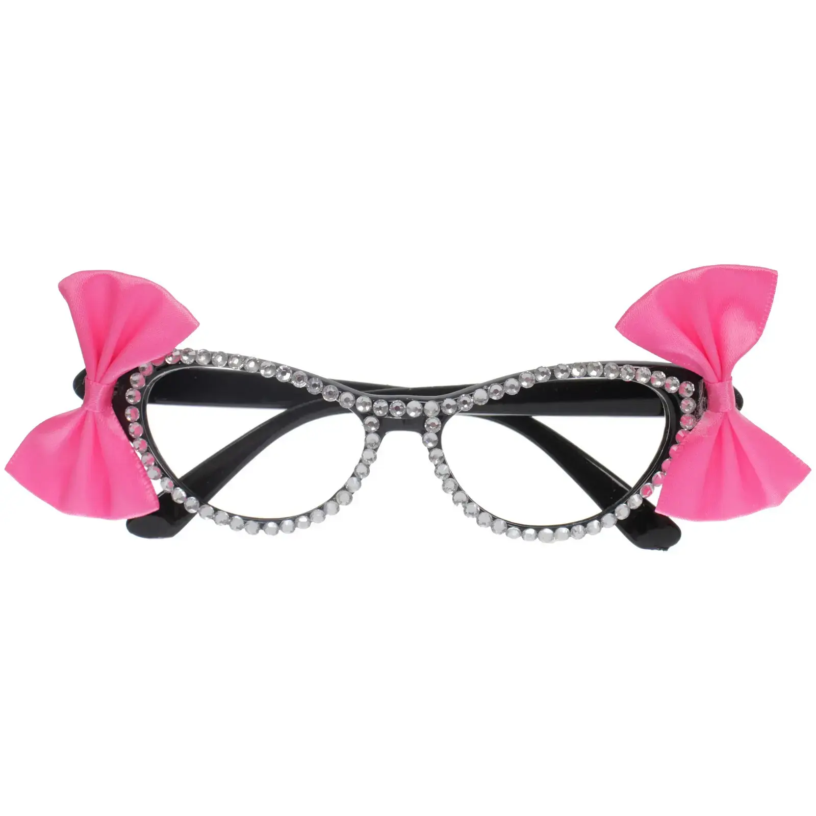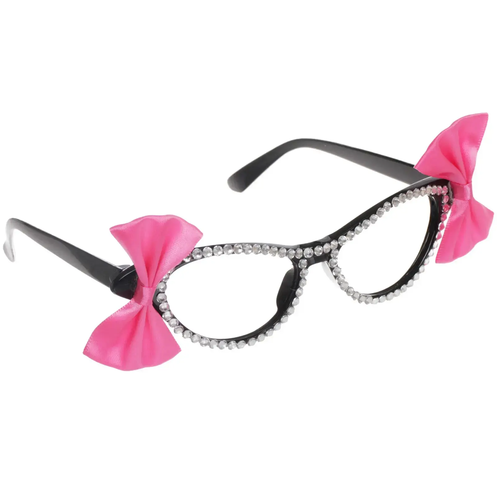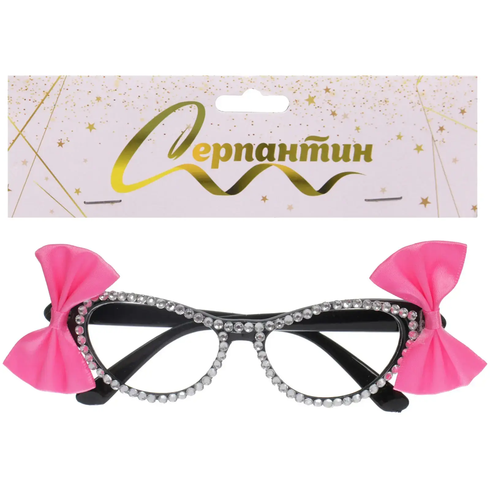 Очки имеют черную пластиковую оправу, украшенную стразами по периметру линз, и большие розовые бантики, которые добавляют игривости и яркости. Линзы прозрачные, без диоптрий, что делает их идеальными для декоративного использования. Размер очков стандартный, что позволяет комфортно носить их на протяжении всего праздника.