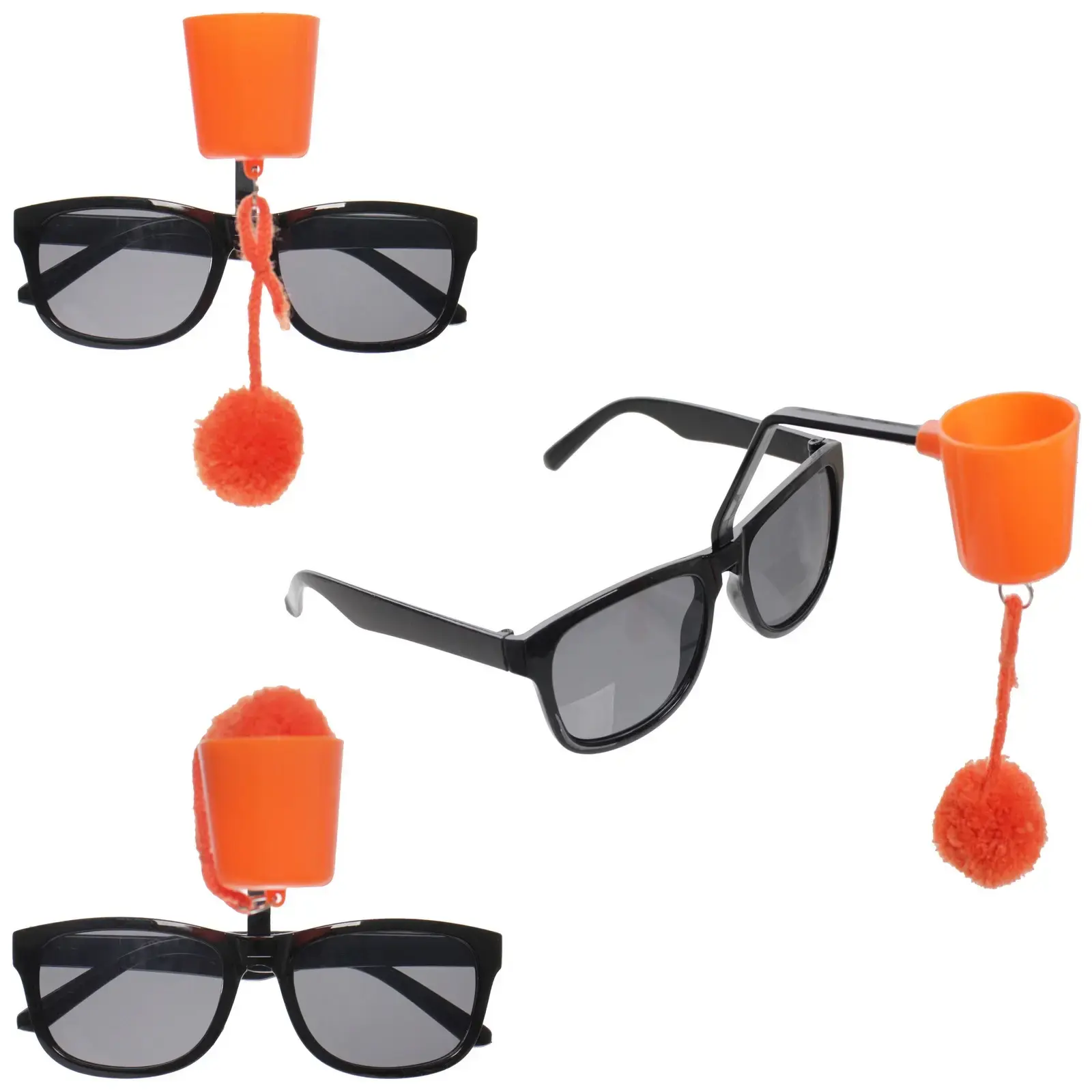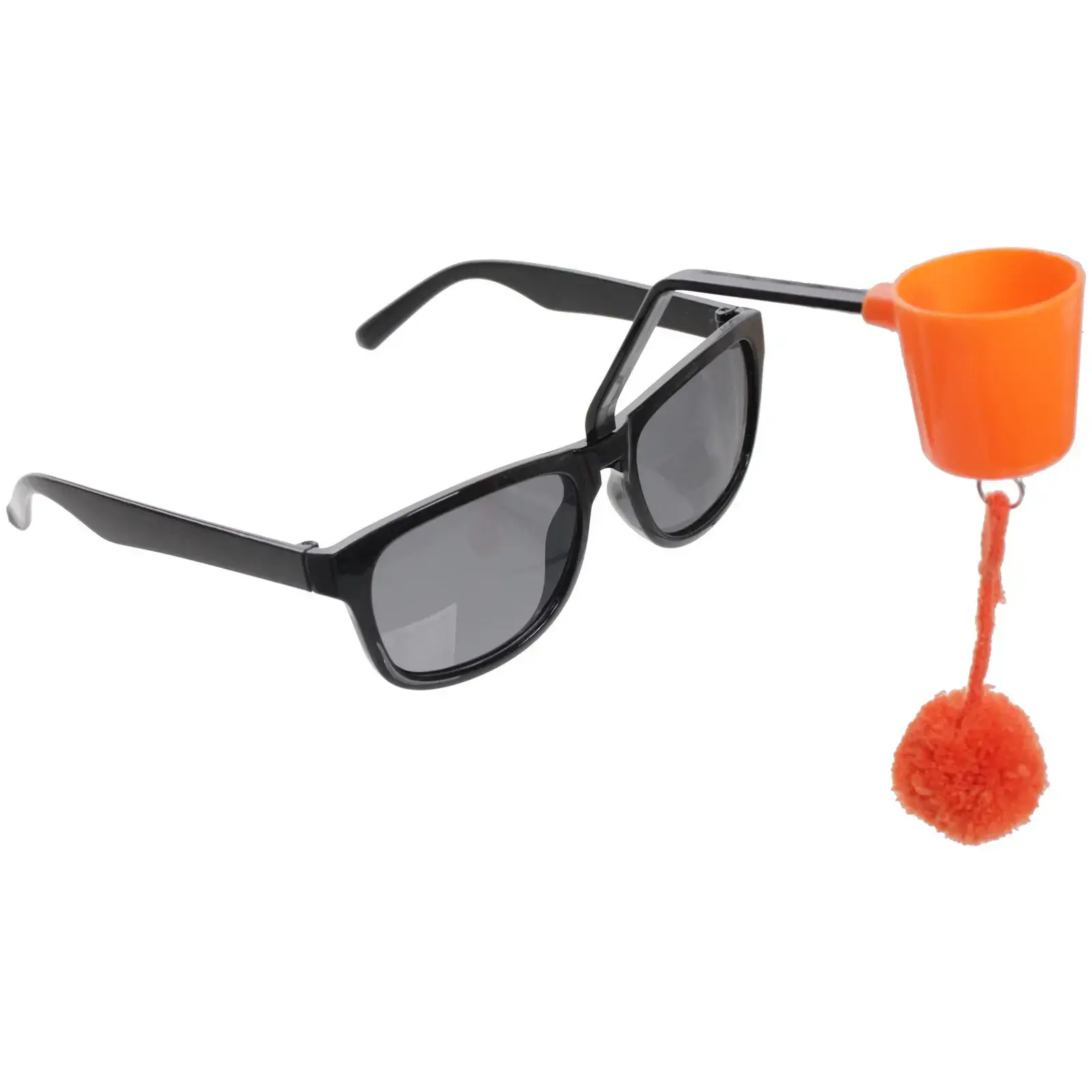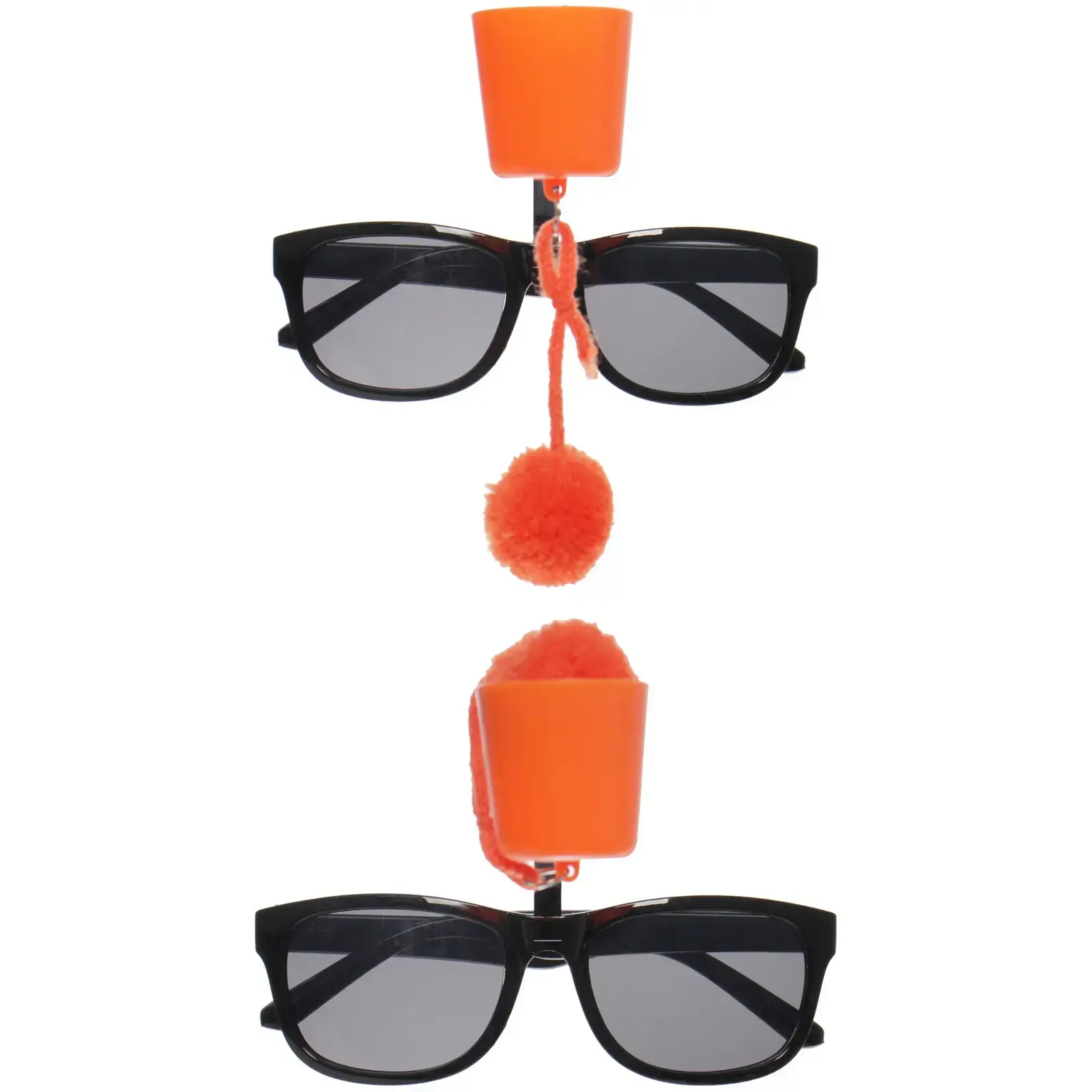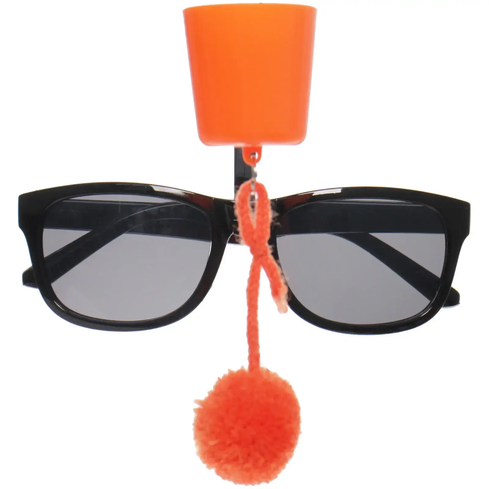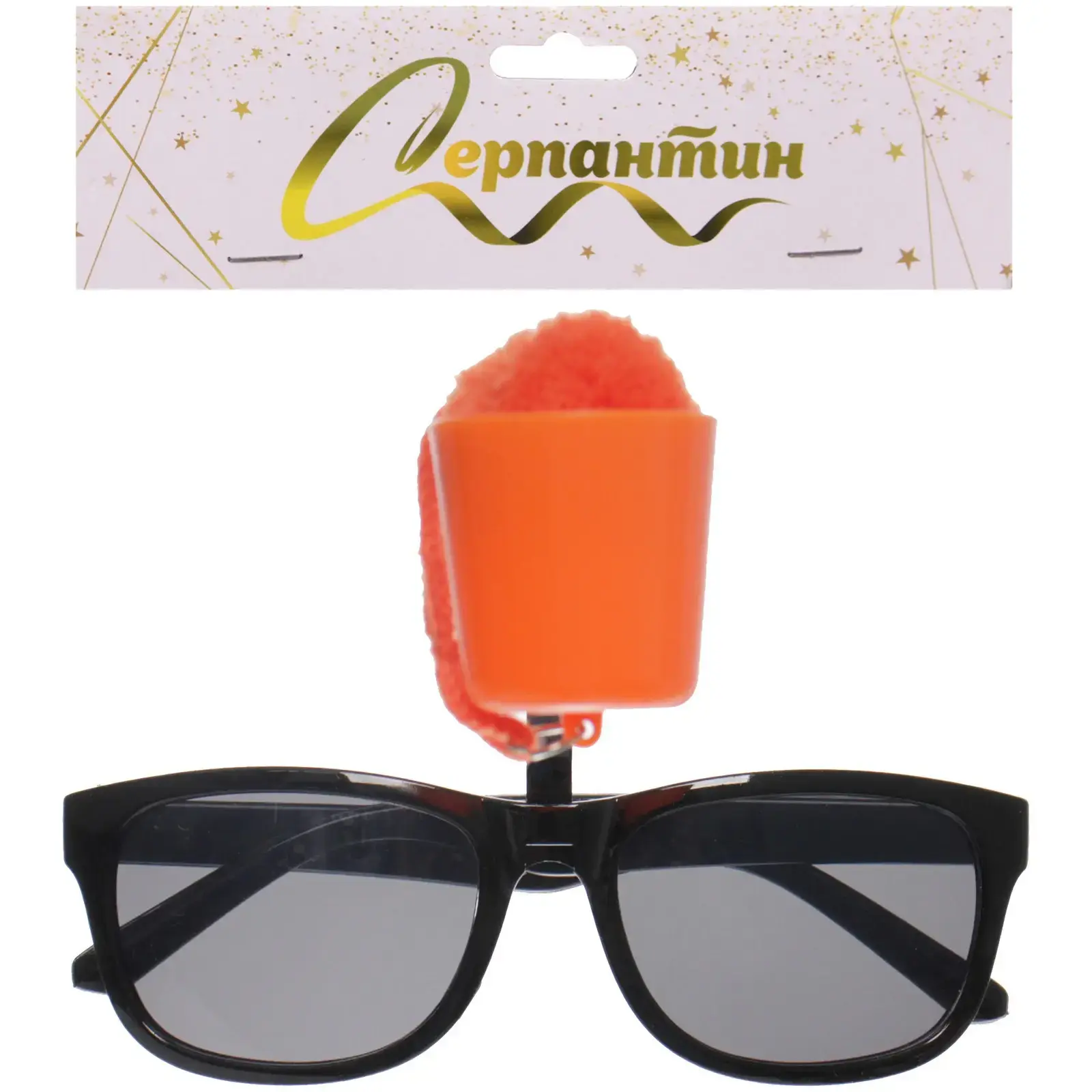 Очки выполнены в классическом черном цвете с затемненными линзами, что делает их универсальными для использования в любое время года. Оранжевый стаканчик с пушистым помпоном, прикрепленный к очкам, добавляет игривости и веселья, что делает их идеальными для карнавала или тематической вечеринки. Эти очки подойдут как для взрослых, так и для детей, создавая атмосферу радости и веселья.