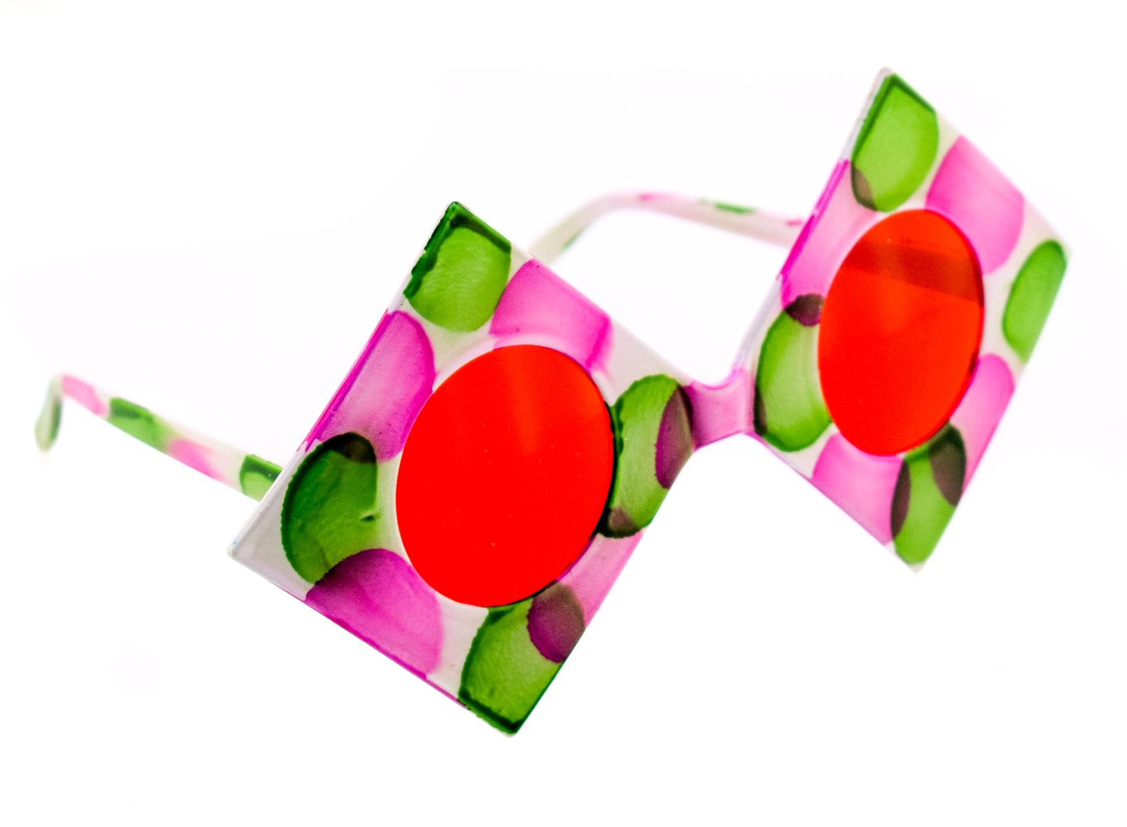 - Уникальный дизайн: Белая оправа с ярким розово-зеленым принтом и красные линзы создают неповторимый и запоминающийся образ.
