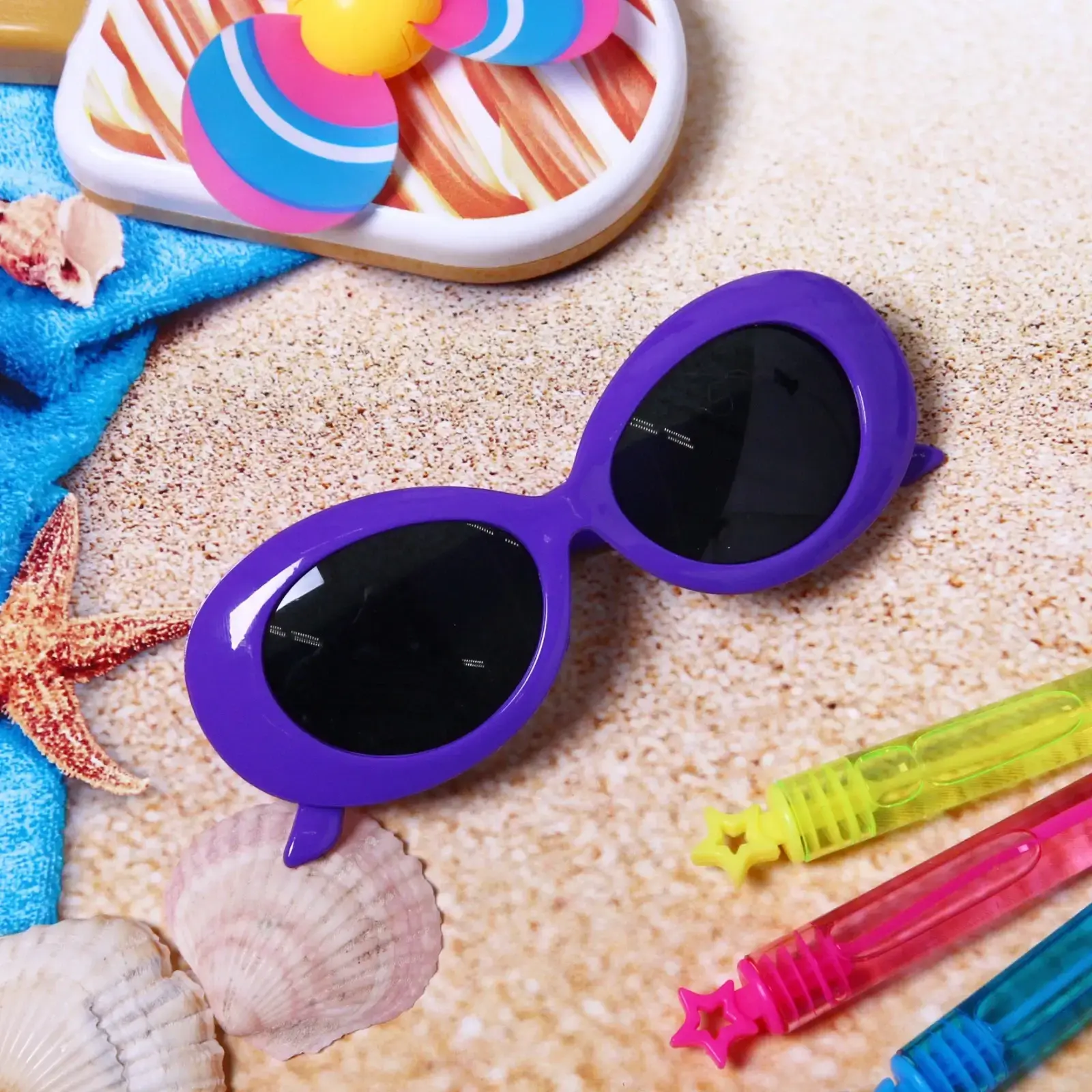 Очки представлены в шести различных цветах: красный, розовый, фиолетовый, синий, белый и черный. Они имеют универсальный размер, что делает их подходящими для большинства детей. Пластиковый материал обеспечивает долговечность и легкость, а стильный дизайн делает их идеальным аксессуаром для летнего сезона.