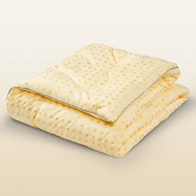 Одеяло выполнено в светло-желтом цвете с квадратным узором, что придает ему современный и стильный вид. Оно аккуратно оформлено с тонкой окантовкой, что добавляет изысканности. Упаковка одеяла также продумана: прямоугольная форма с ручкой для удобства переноски делает его идеальным для подарка или хранения.
