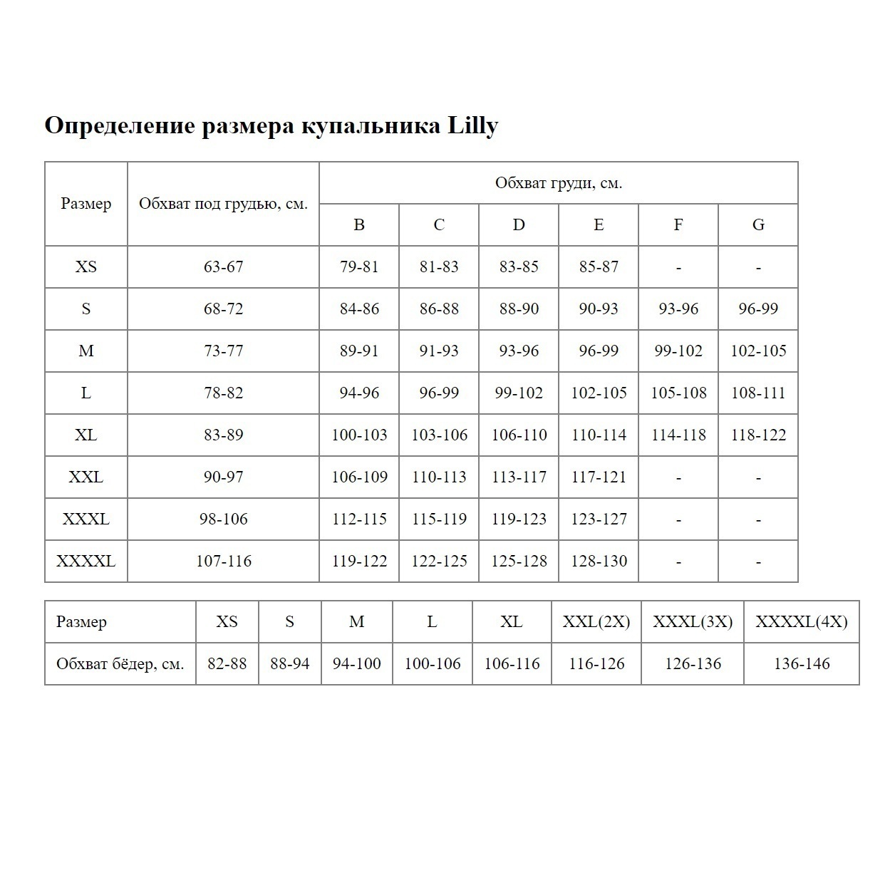 Производитель Lilly предоставляет подробную таблицу размеров, учитывающую обхват под грудью и бедра. Для точного определения размера рекомендуем ориентироваться на ваши стандартные параметры одежды.