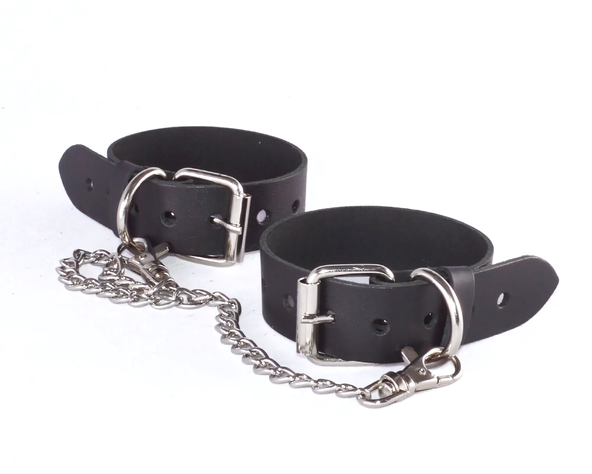 Черные кожаные оковы созданы для тех, кто ценит безопасность, удобство и чувственную атмосферу. Модель «Новичок» подходит для мягкого знакомства с БДСМ-практиками и позволяет контролировать движения партнера без дискомфорта. Натуральная кожа приятно ощущается на коже, а продуманная конструкция обеспечивает надежную фиксацию.