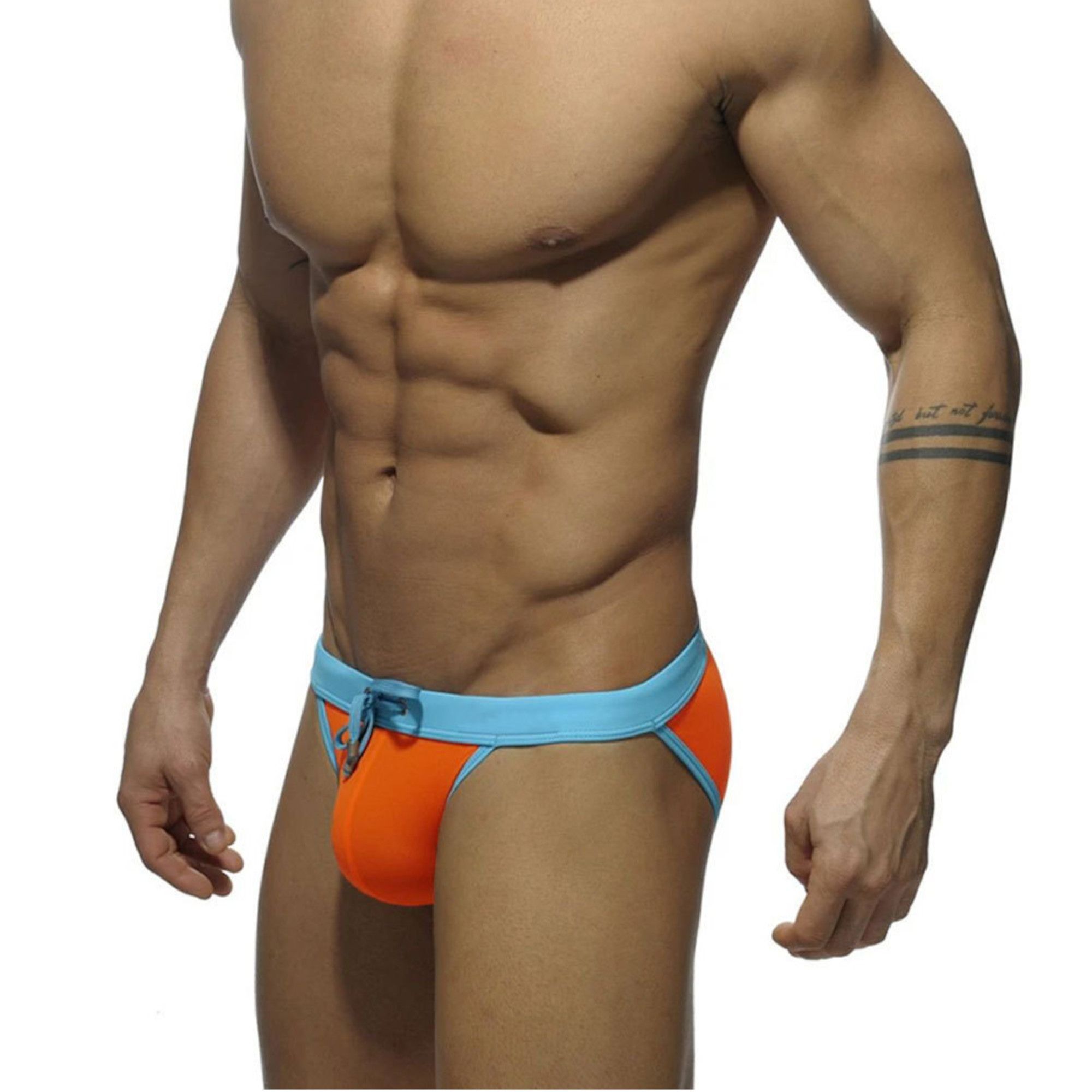 Оранжевые плавки-танга с контрастным голубым поясом созданы для мужчин, которые ценят стиль и комфорт. Модель сочетает смелый дизайн с практичностью, идеально подходит для пляжа или бассейна.