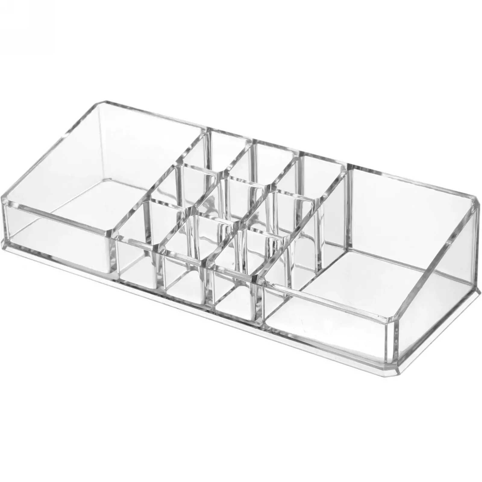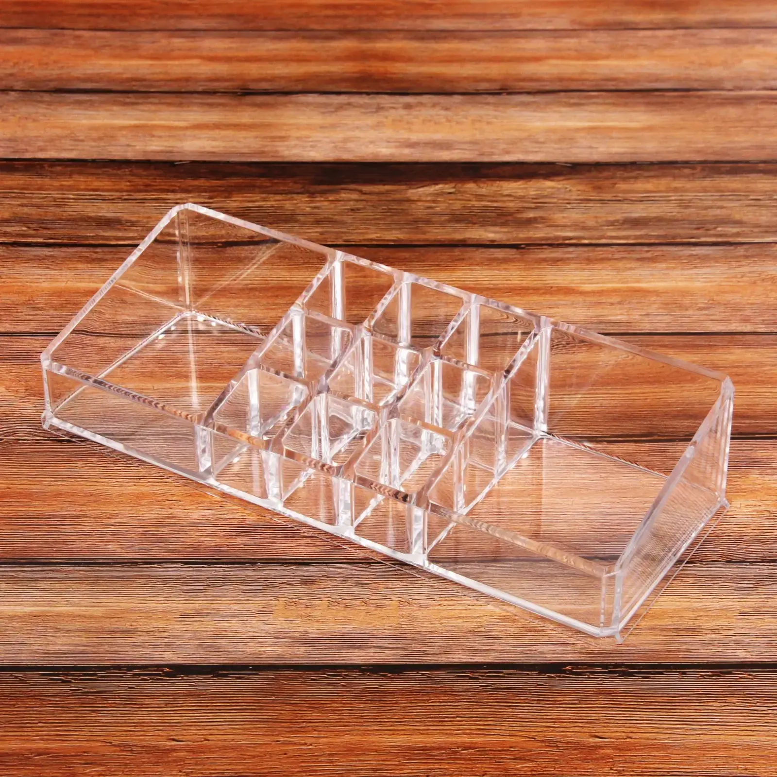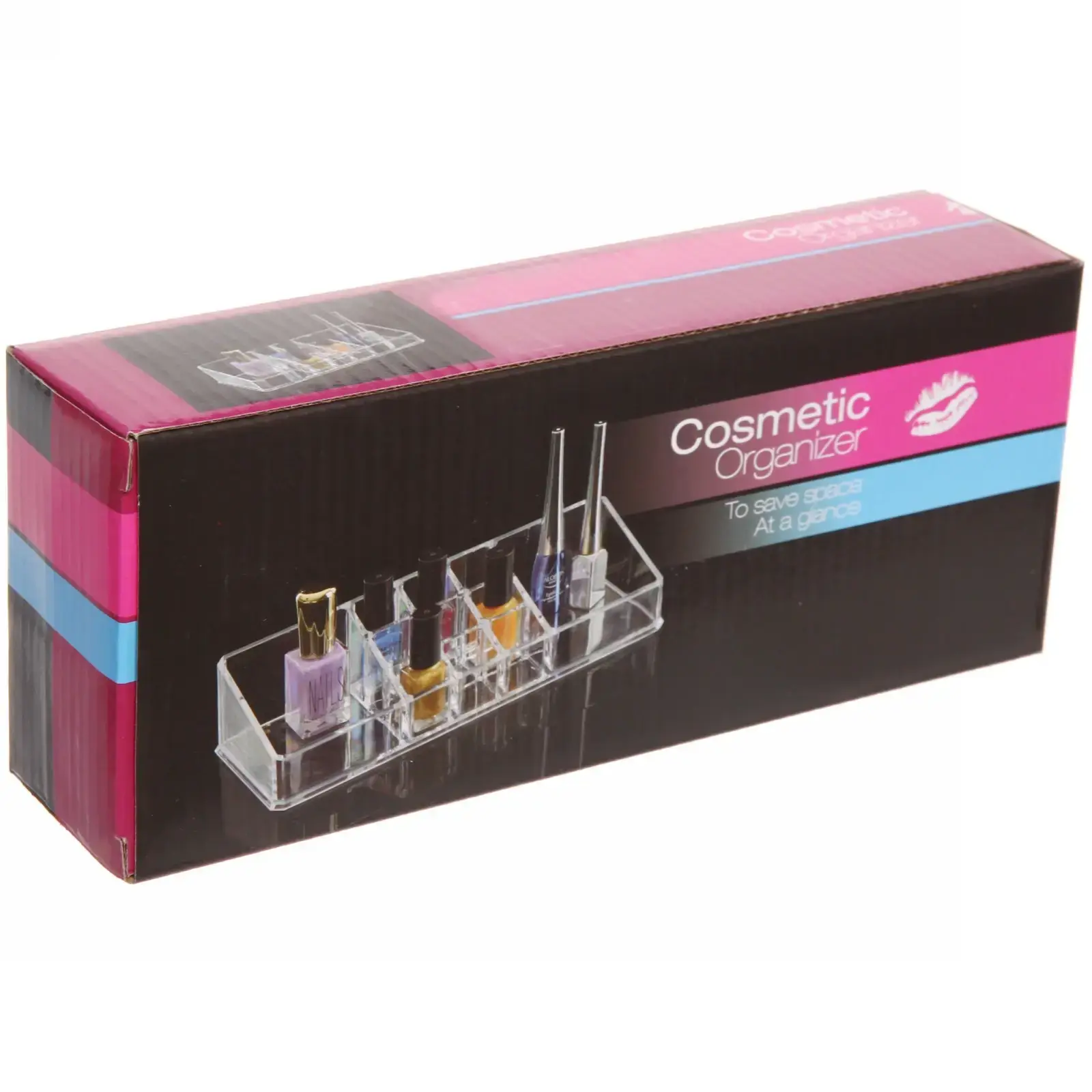 Расставьте флаконы с лаком для ногтей вертикально в больших отделениях, разместите заколки и бижутерию в средних ячейках, а в узких секциях храните кисти для макияжа или ручки. Благодаря прозрачным стенкам вы сразу увидите, где что находится — больше не придётся тратить время на поиски.
