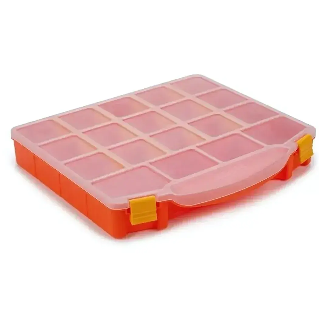 Идеален для мастерских, детских комнат, гаражей и офисов. Компактные размеры 27×40 см позволяют размещать контейнер на полках, в шкафах или переносить с собой благодаря удобной ручке.