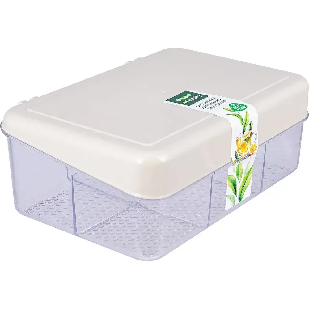 Изготовлен из качественного пластика, основание прозрачное, крышка светлого цвета. Перегородки делят внутренний объём на три части. Ёмкость контейнера — 0,5л. Благодаря структурированному дну пакетики не скользят внутри, а гладкая крышка обеспечивает плотное закрытие.