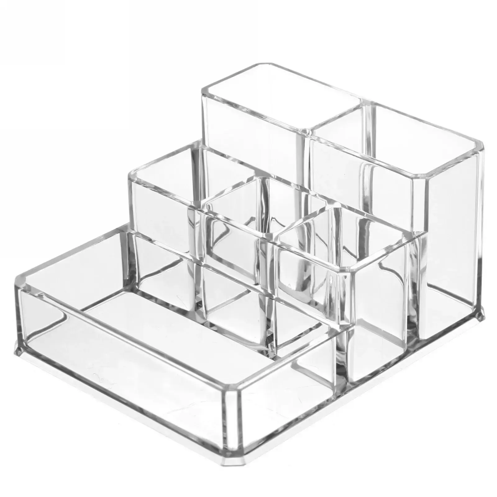 Этот органайзер состоит из 6 отделений различной величины, что делает его универсальным для хранения косметических средств, канцелярии или других мелких предметов. Его размеры 12,5х10,5х6,5 см позволяют разместить его даже на ограниченном пространстве, а ступенчатая структура обеспечивает удобный доступ к содержимому.