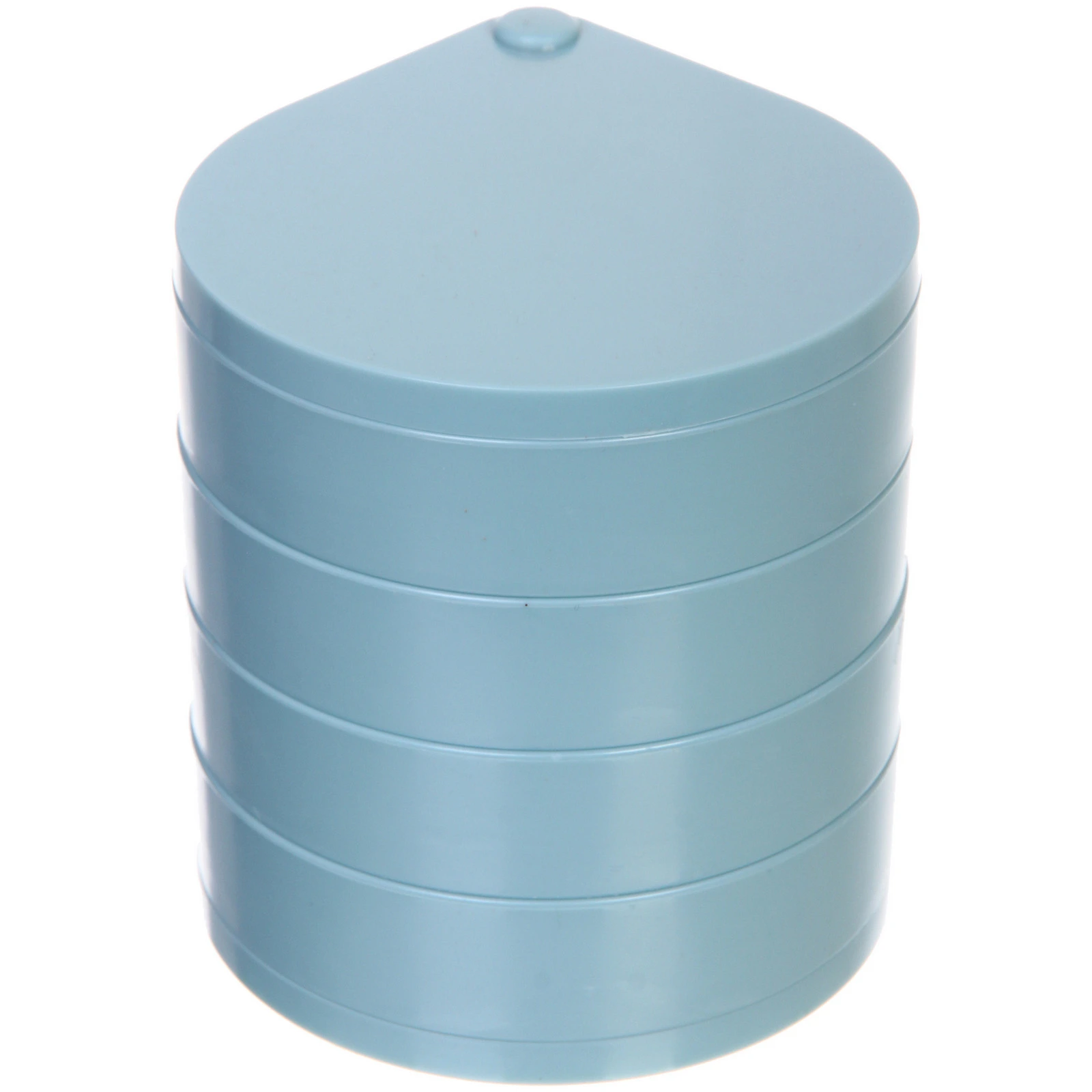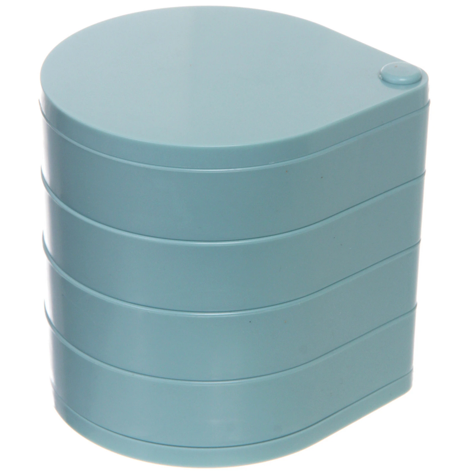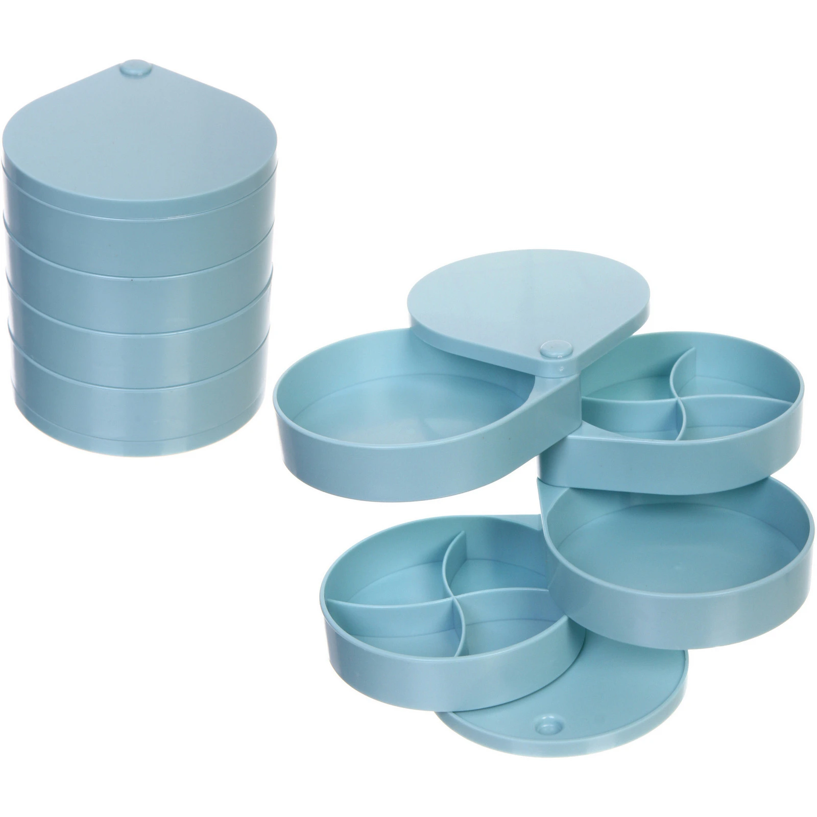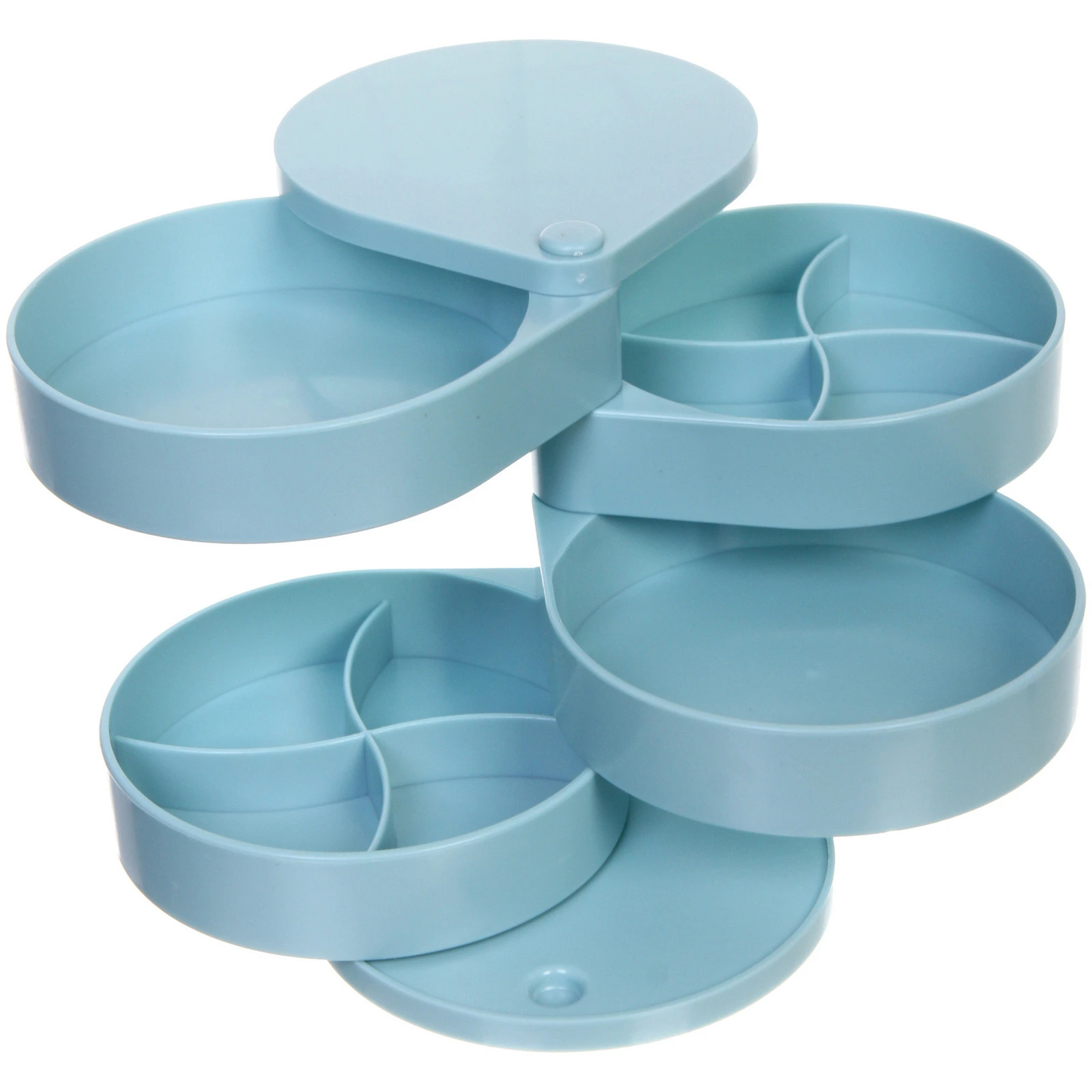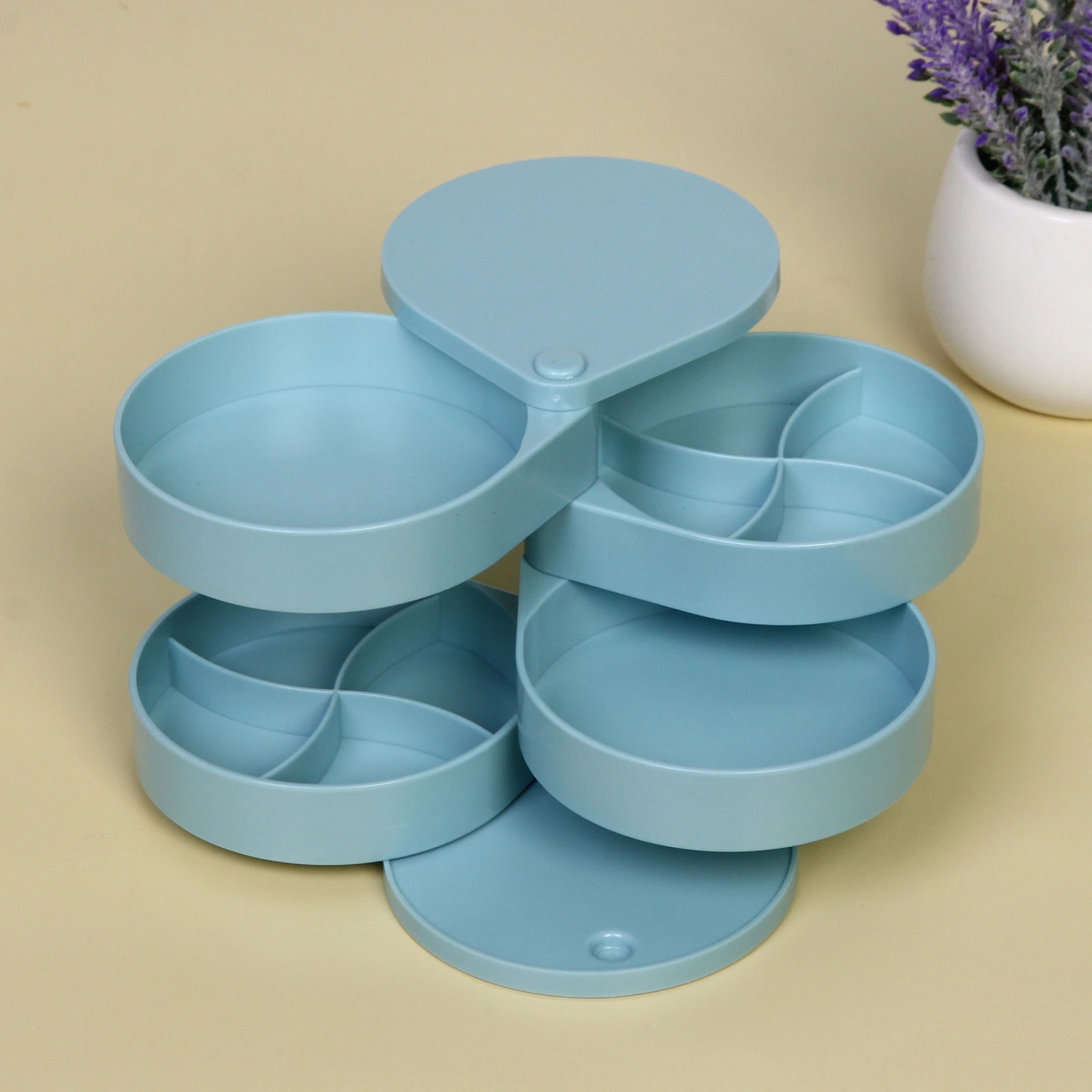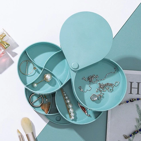 Органайзер состоит из пяти круглых ярусов, которые легко вращаются вокруг центральной оси, открывая доступ к любому отделению. Часть секций разделена перегородками, что позволяет аккуратно сортировать серьги, кольца, цепочки и другие мелкие предметы, предотвращая их спутывание и потерю.