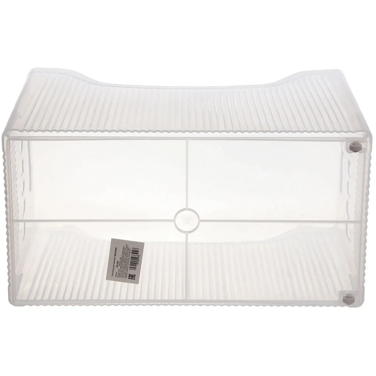 Размеры органайзера составляют 33.6 см в длину, 17.2 см в ширину и 25.2 см в высоту. Материал — качественный пластик, который легко чистится и не боится влаги. Прозрачный цвет позволяет видеть содержимое, что упрощает поиск нужных вещей.