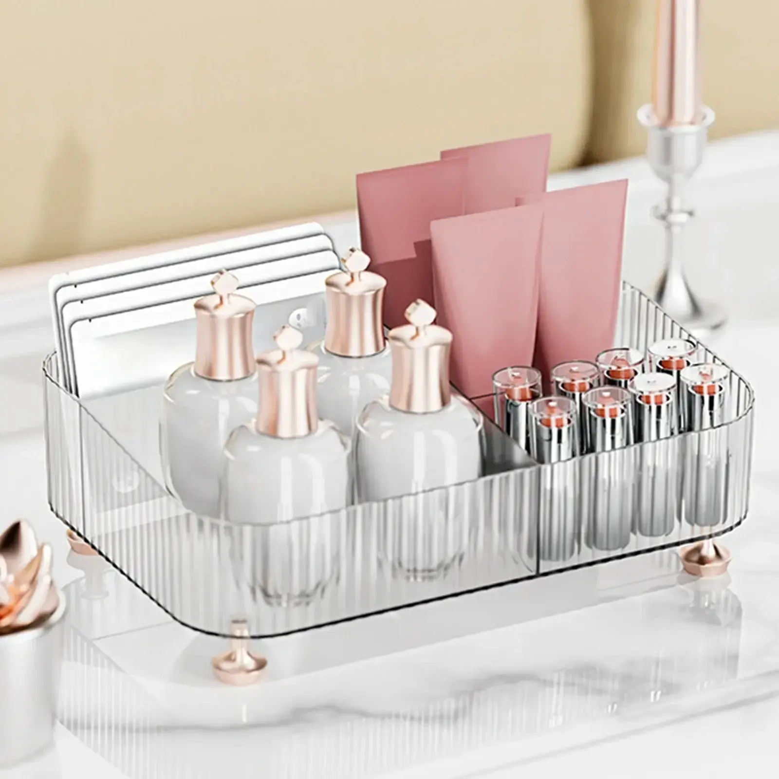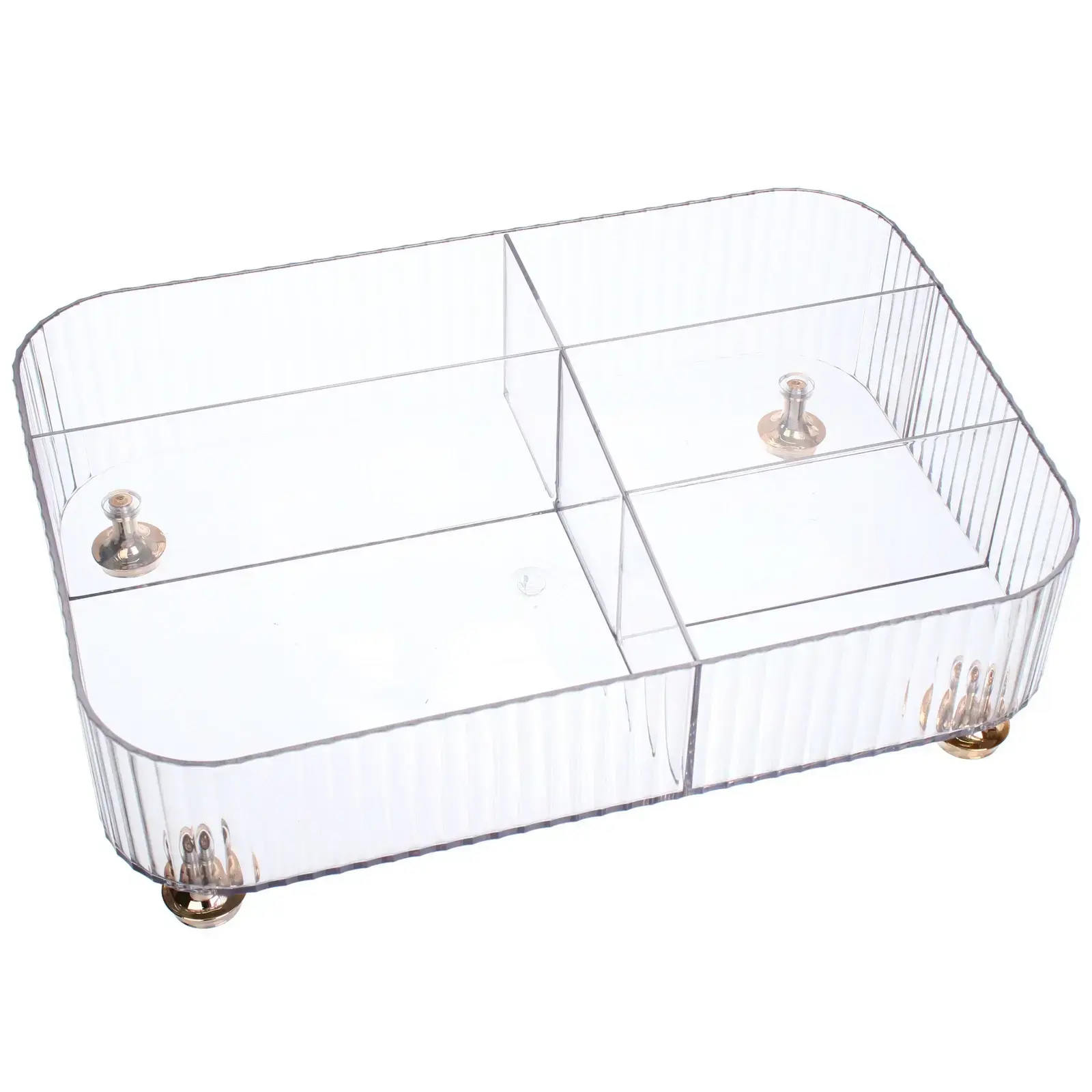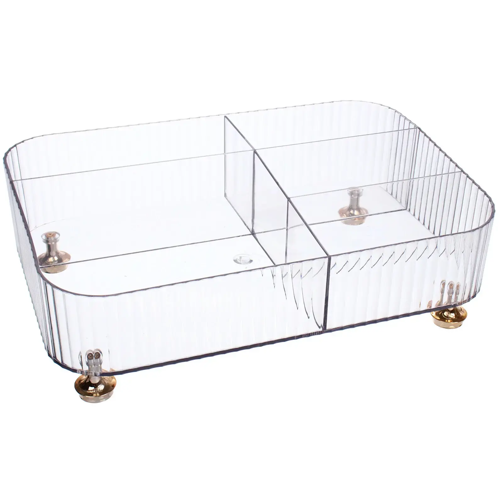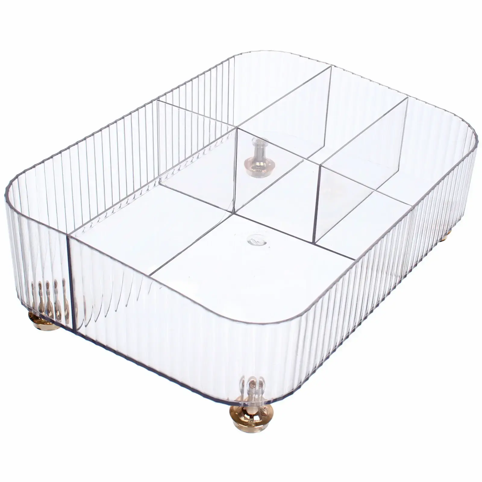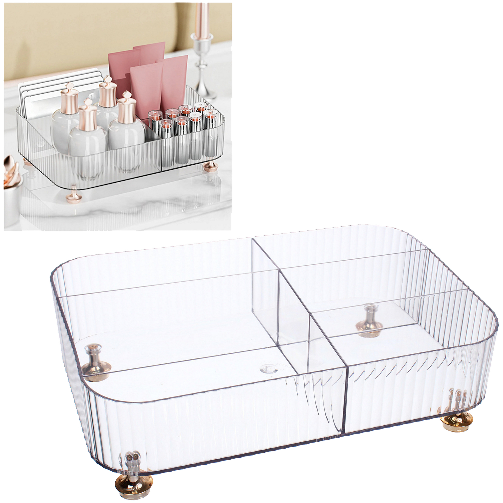 Прозрачный органайзер с золотистыми ножками создан для тех, кто ценит организацию пространства. Практичный пластик и продуманная конструкция сохранят ваши кремы, флаконы и кисти в идеальной доступности.