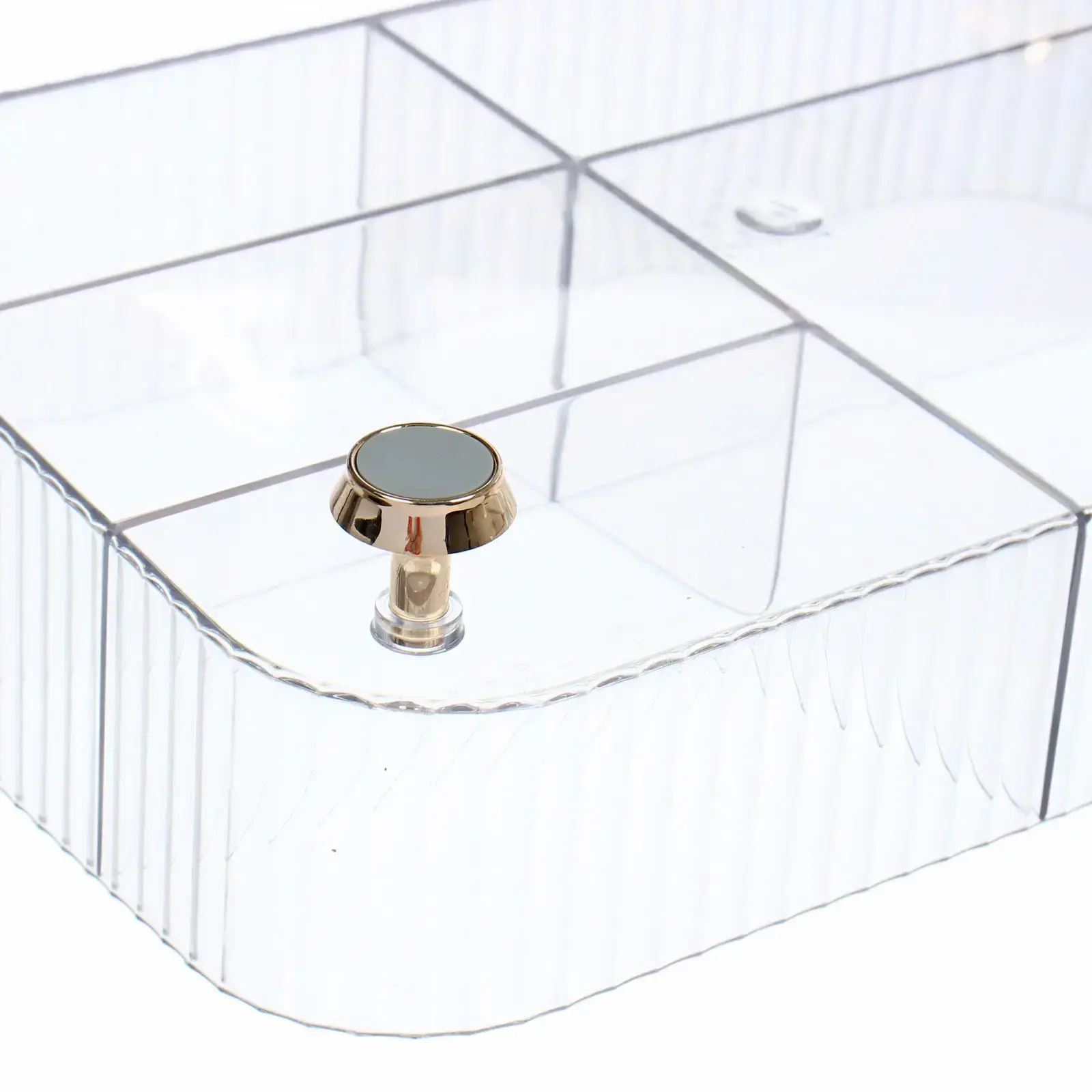 Идеальное решение для организации косметички, рабочего стола визажиста или полочки в ванной. Сохраняет порядок и добавляет эстетики в интерьер благодаря прозрачному дизайну и золотистым акцентам.
