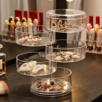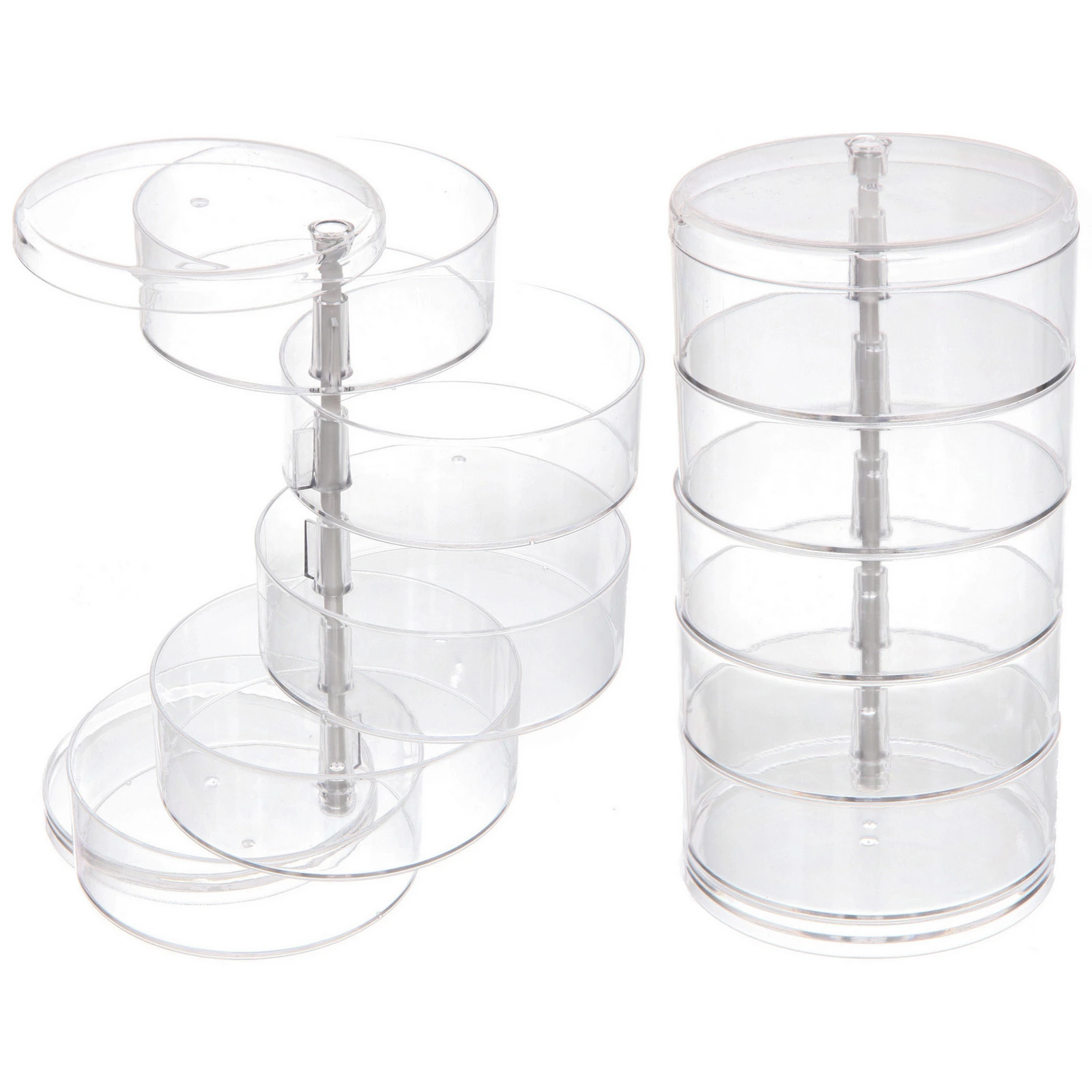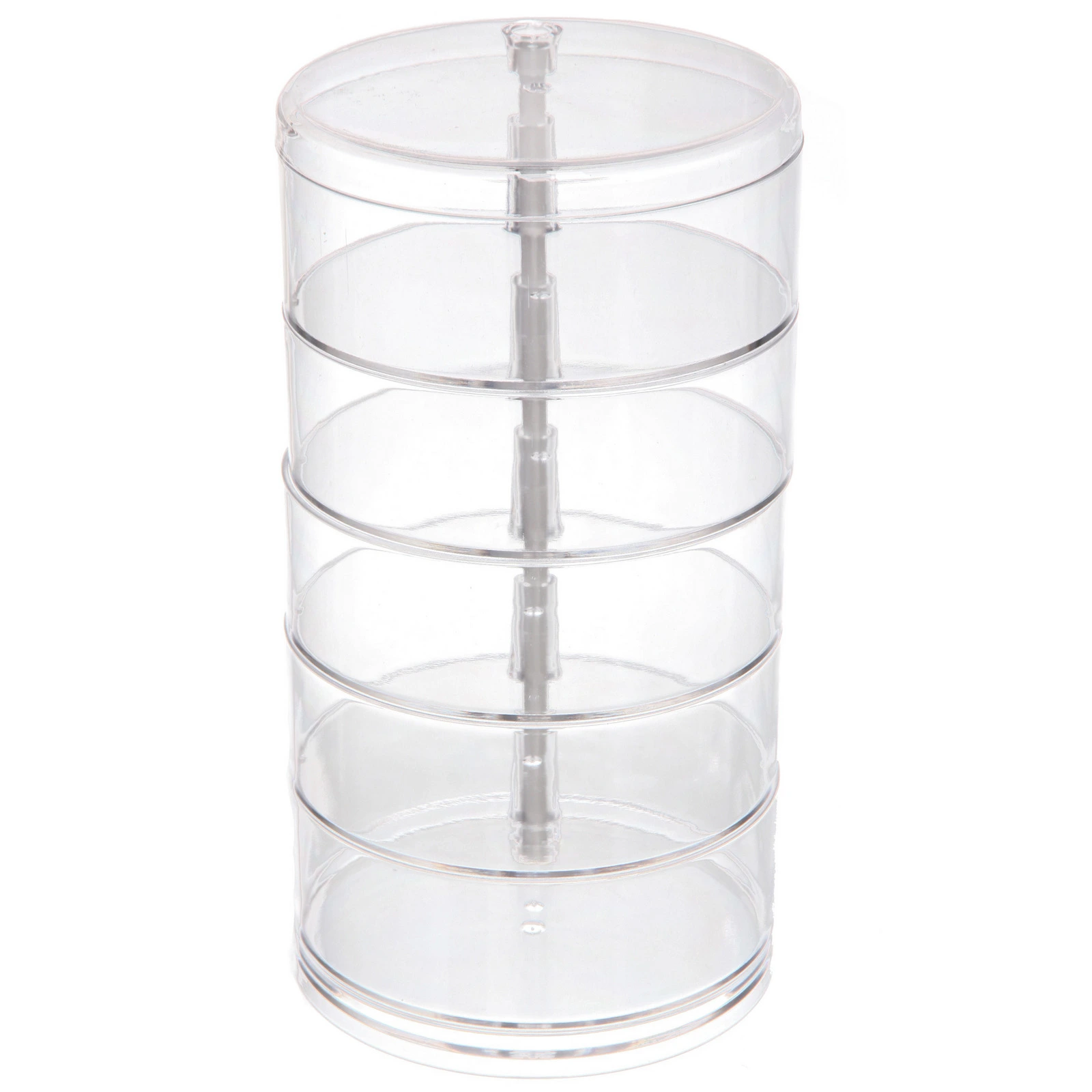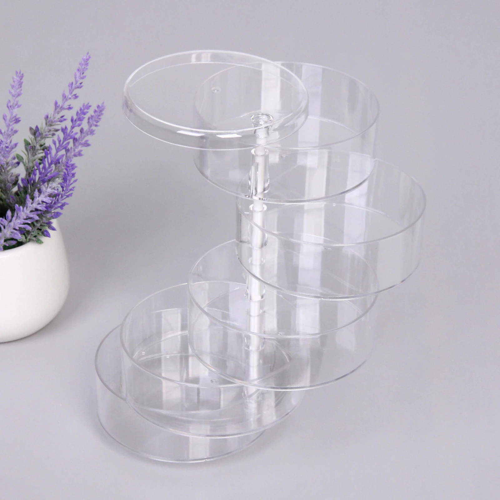 Органайзер состоит из пяти круглых отделений, которые вращаются вокруг центральной оси. Вы можете развернуть их веером, чтобы видеть содержимое всех ярусов одновременно, или сложить в компактную колонну для экономии места на столе, полке или туалетном столике. Каждый прозрачный лоток имеет невысокие бортики, что удобно для хранения и извлечения даже мелких предметов.