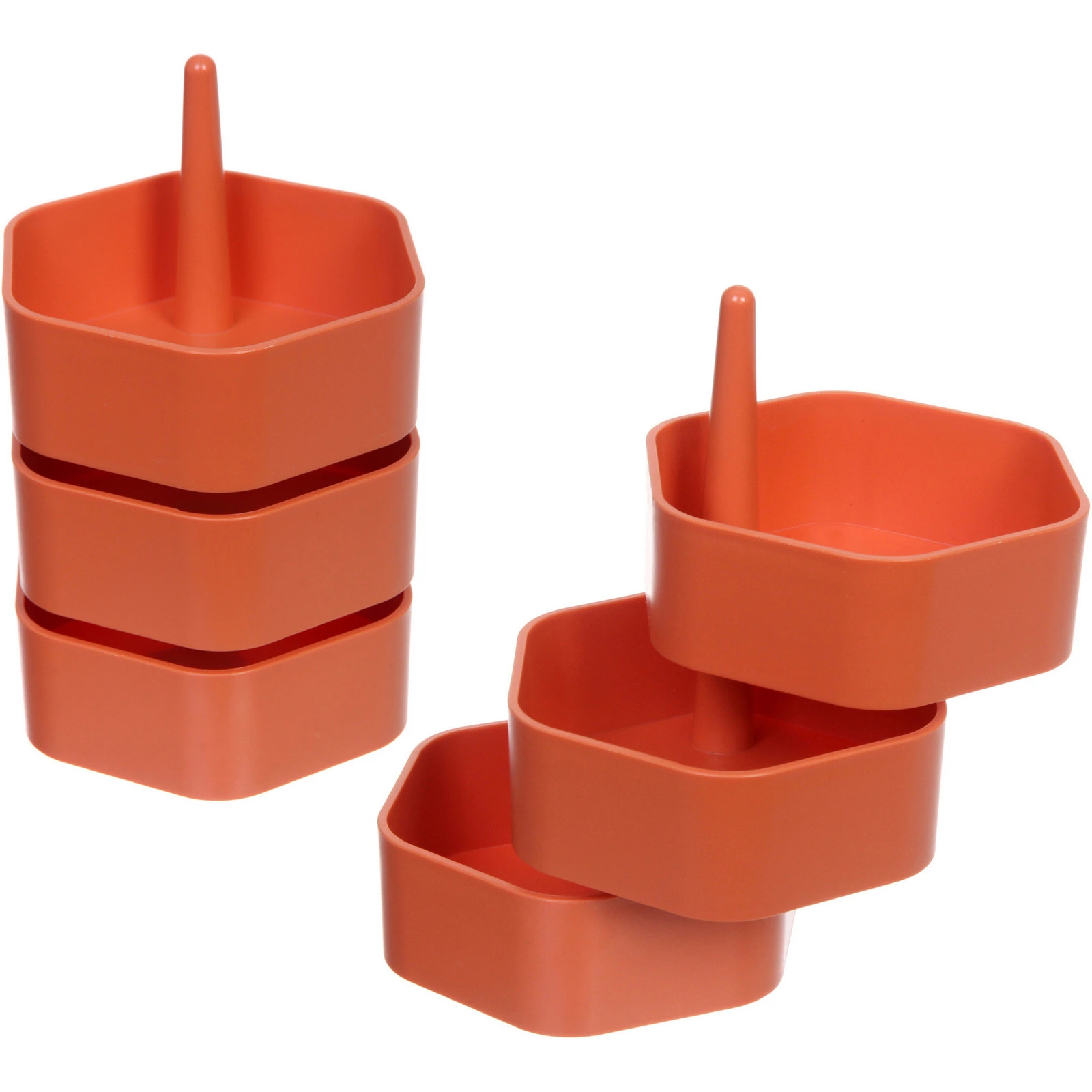 Органайзер состоит из трёх одинаковых секций, закреплённых на центральной стойке. Его ключевая особенность — возможность вращения и ступенчатого расположения ярусов. Это позволяет легко получить доступ к содержимому любой секции, не загораживая обзор другим отделениям. Каждая секция представляет собой вместительную чашу с высокими бортиками, которая надёжно удержит даже мелкие предметы.