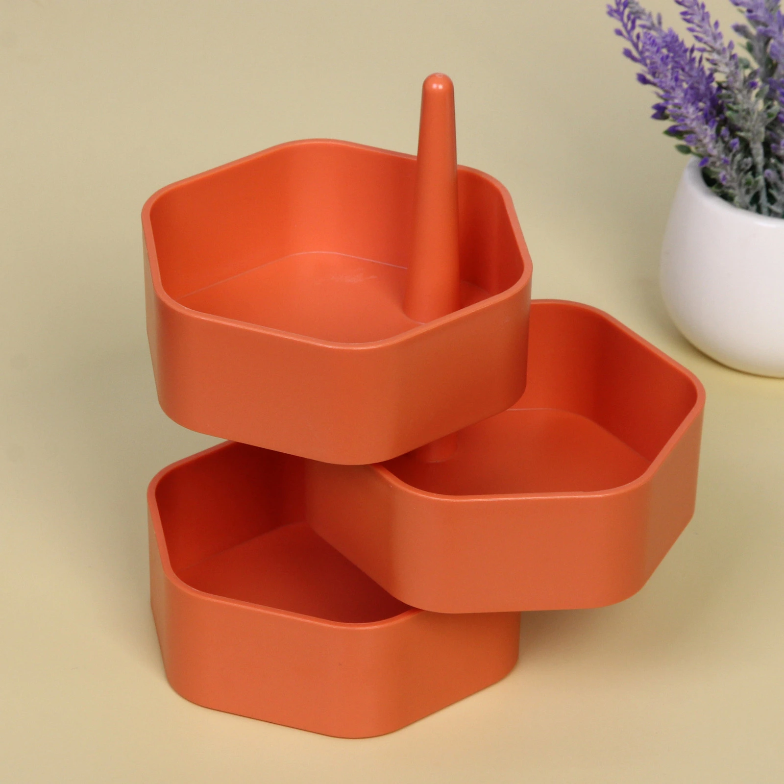 Забудьте о хаосе в ящиках и на полках! Этот трёхъярусный вращающийся органайзер «Марципан» — элегантное и практичное решение для хранения множества мелочей. Его продуманная конструкция и приятный коралловый цвет не только помогут навести порядок, но и станут стильным акцентом в интерьере вашей комнаты, ванной или рабочего кабинета.
