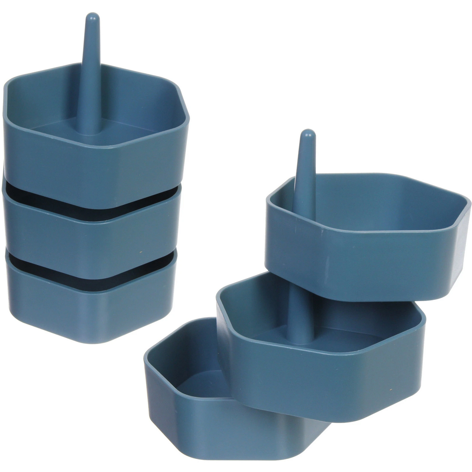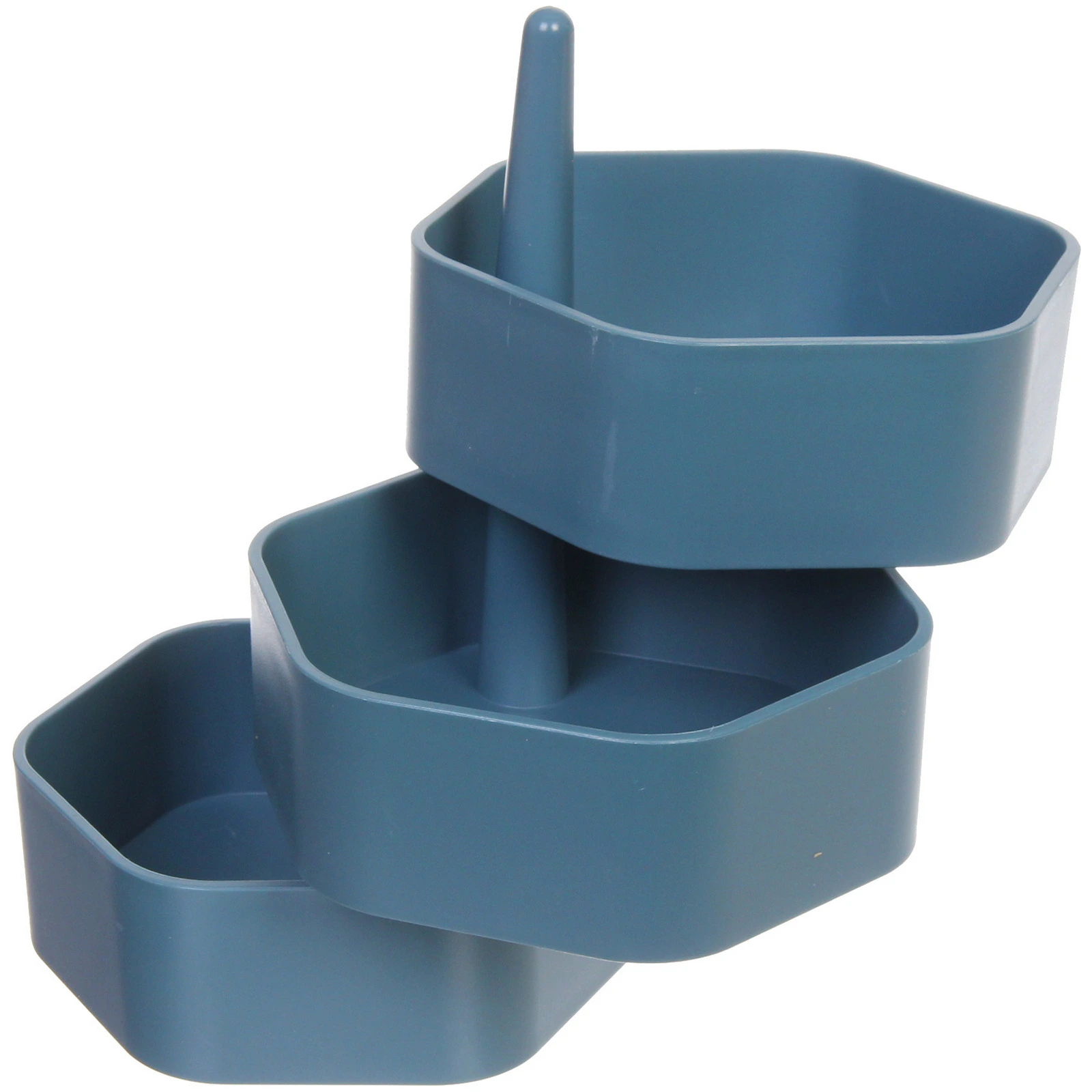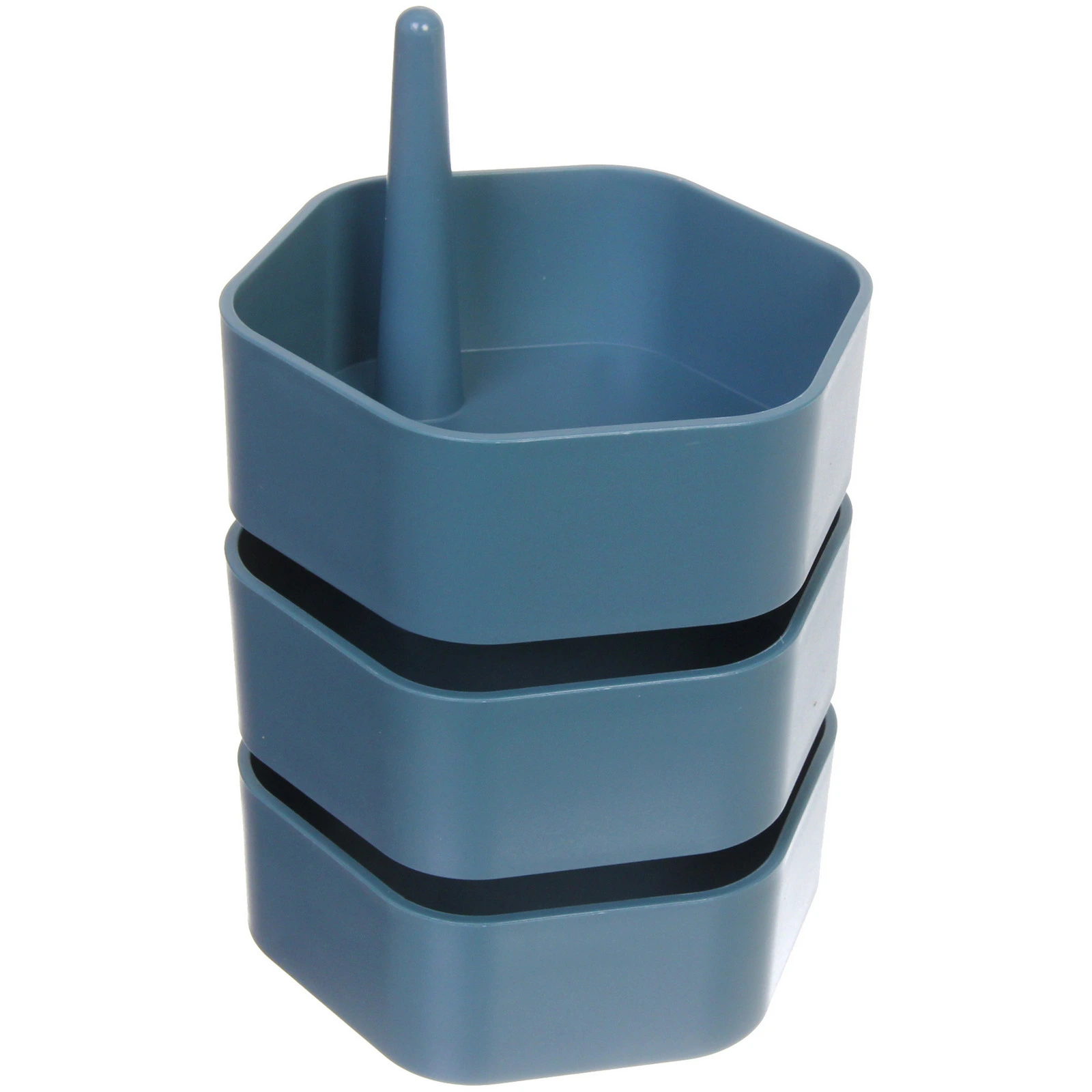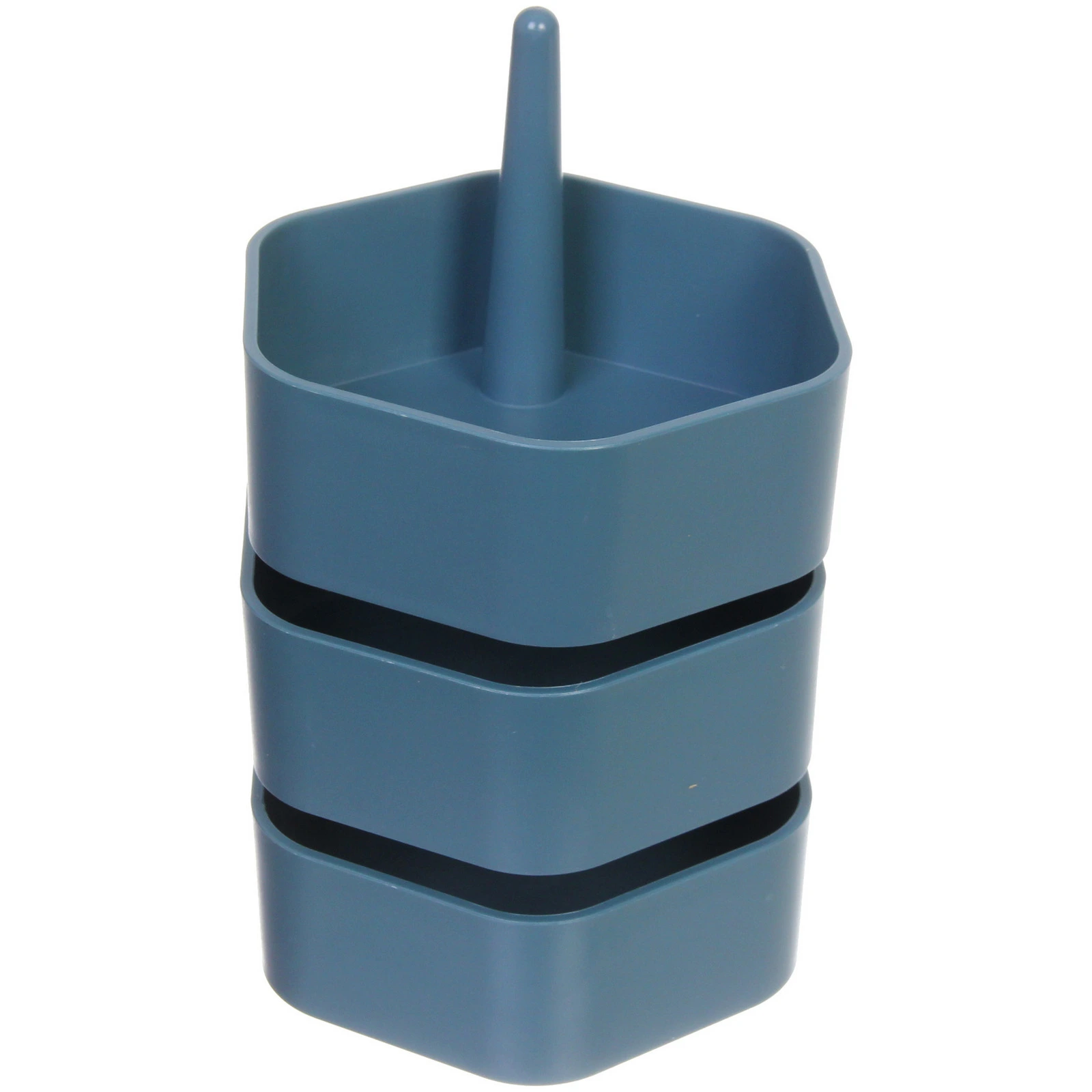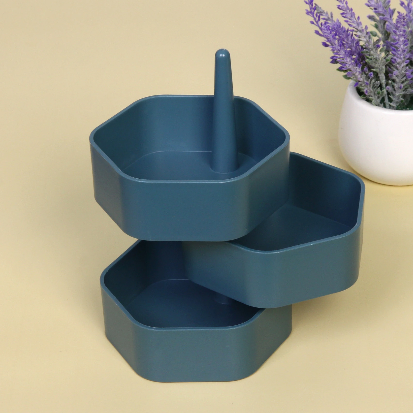 Органайзер изготовлен из прочного пластика, который обеспечивает долговечность и лёгкий уход. Матовое покрытие цвета морская волна выглядит стильно и современно, отлично вписываясь в различные интерьеры. Шестиугольная форма каждой секции и вращающаяся конструкция на центральном стержне позволяют легко получить доступ к содержимому любого отделения, просто повернув нужный ярус. Такое решение экономит пространство и делает использование максимально удобным.