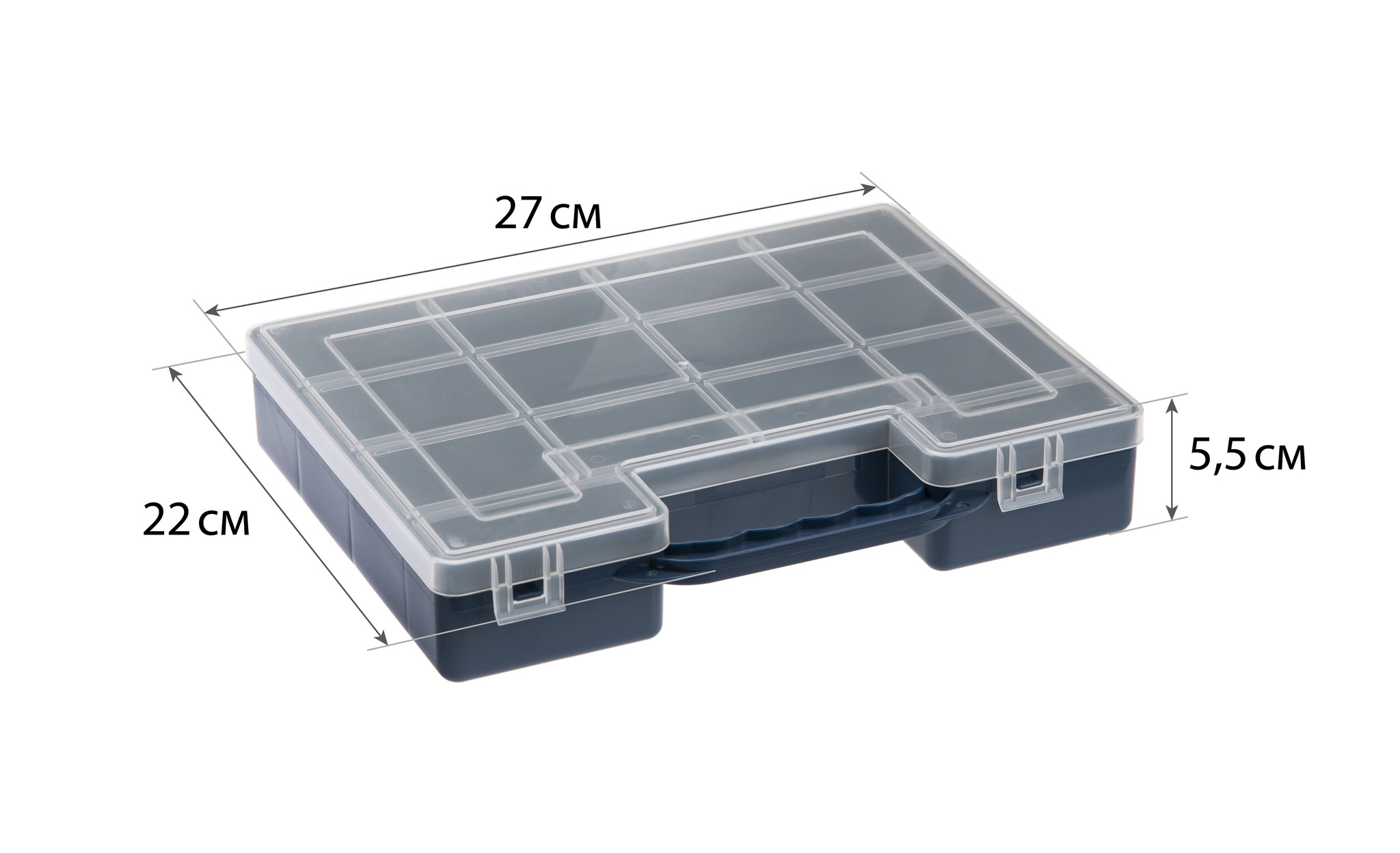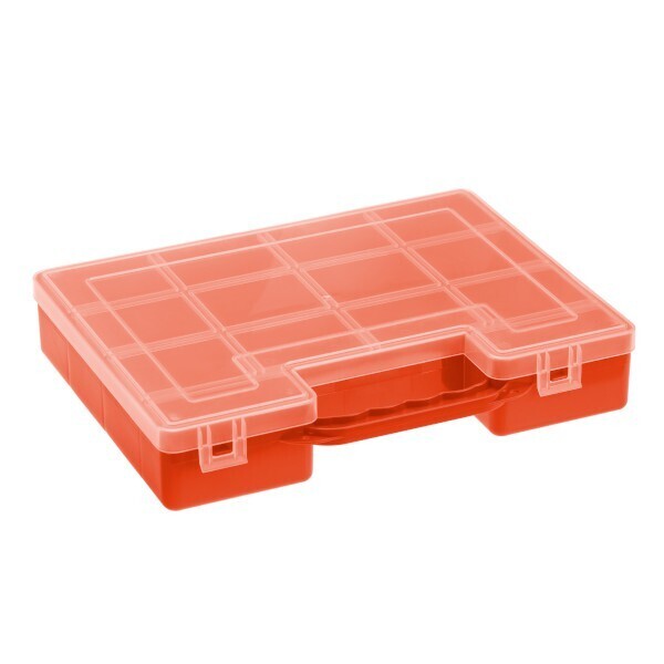 Компактный размер (270x220x55 мм) позволяет разместить органайзер даже в ограниченном пространстве. Яркие цветовые решения (красный, синий, оранжевый) добавляют практичности при использовании.