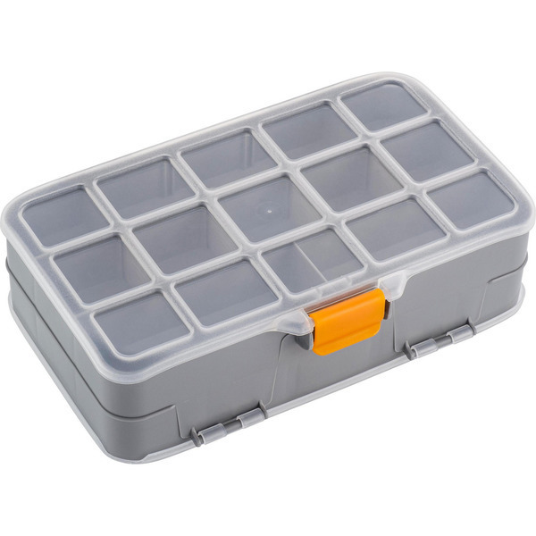 Изготовленный из прочного пластика, органайзер имеет серо-свинцовый цвет с оранжевой защелкой для фиксации. Его размеры и конструкция позволяют легко переносить и хранить, что делает его идеальным выбором для коллекционирования и занятий хобби. Не упустите возможность упорядочить свои мелочи с помощью этого удобного органайзера!
