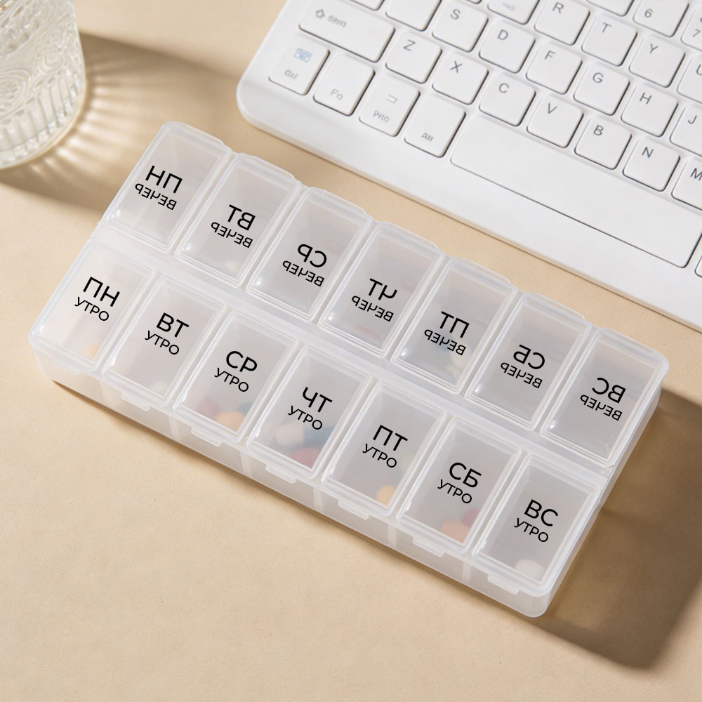 Преимущества: компактность, прочность, прозрачность, удобство деления на 7 дней и 2 временных приема — утро и вечер. Изготовлен из надежного пластика, легко моется и занимает минимум места.