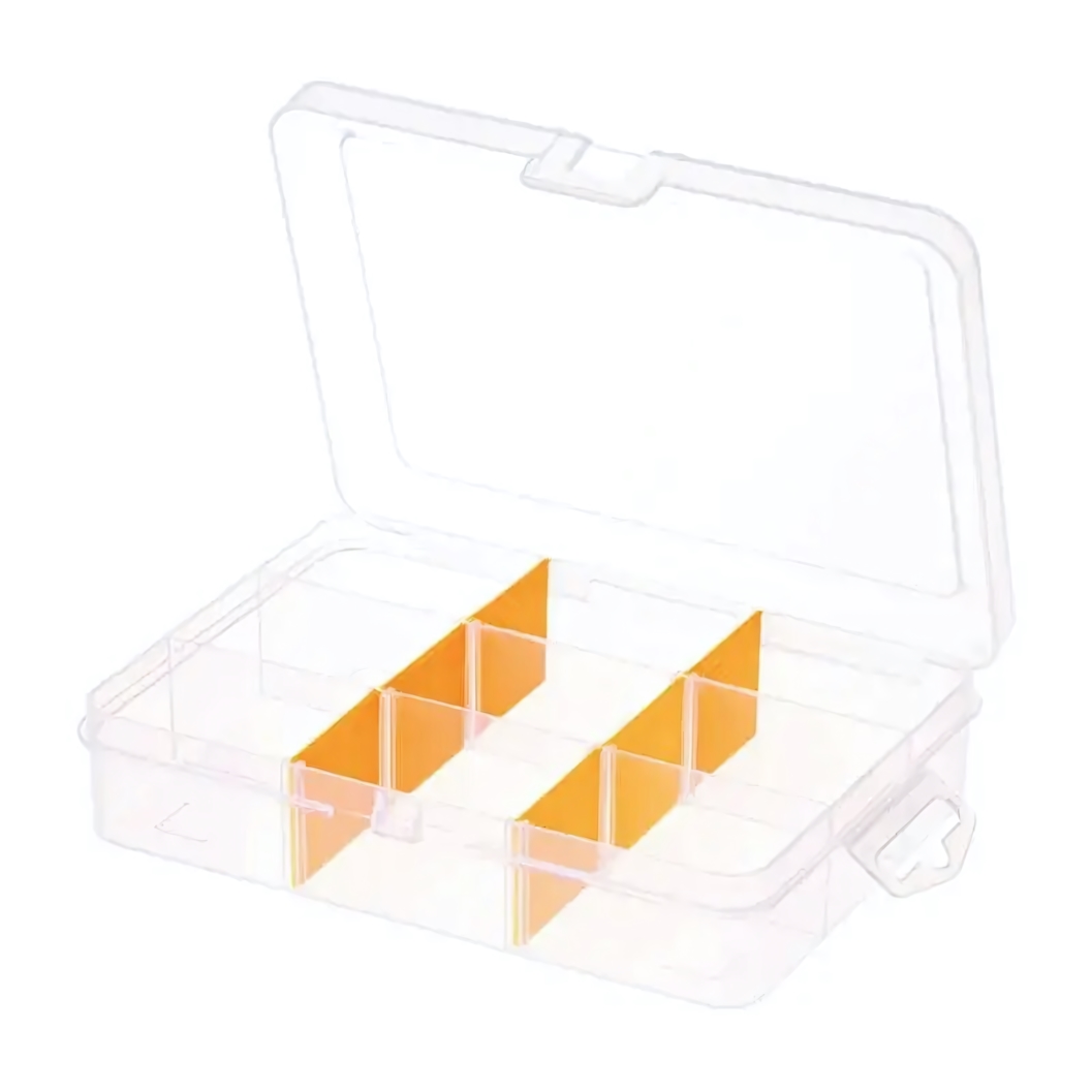 Коробка изготовлена из прочного прозрачного пластика, что обеспечивает отличный обзор содержимого и удобство поиска нужных элементов. Внутри расположены восемь разделителей, окрашенных в яркий оранжевый цвет, что помогает быстро ориентироваться и упорядочить предметы внутри коробки. Простая схема использования подходит как для хозяйственных нужд, так и для хранения небольших деталей в мастерской или на складе.