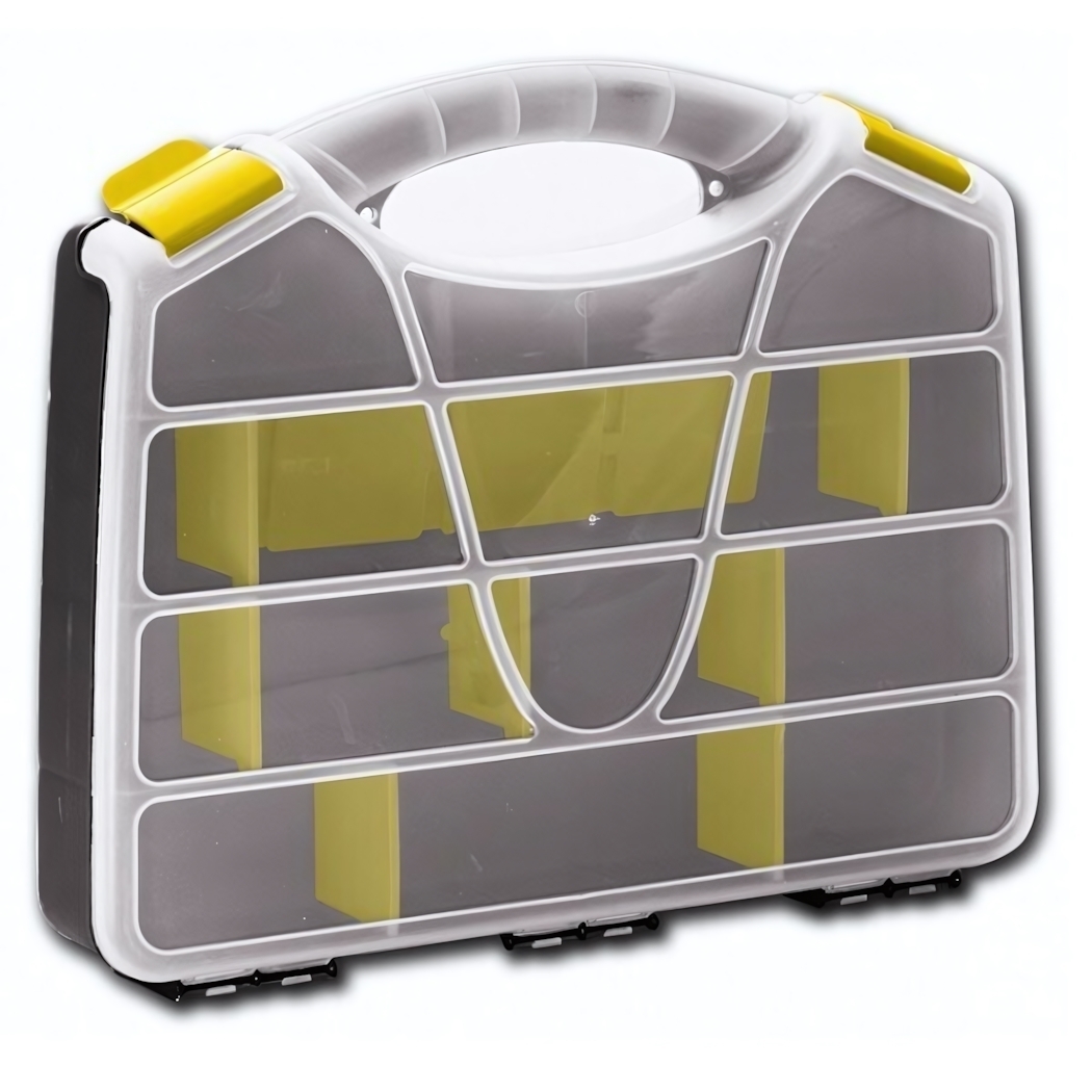 18 съемных перегородок позволяют настраивать размер отсеков под ваши потребности. Прозрачная крышка дает возможность видеть содержимое, не открывая органайзер. Эргономичная ручка обеспечивает комфортную транспортировку даже при полной загрузке.