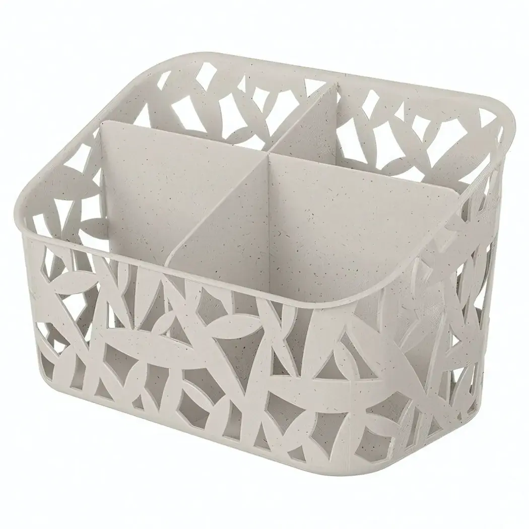 Практичный и функциональный органайзер с четырьмя секциями разной высоты поможет удобно хранить канцтовары, косметику или мелкие предметы. Стильный растительный орнамент и нейтральная бежевая гамма создают эстетичный акцент, который гармонично впишется в интерьер спальни, ванной или рабочего кабинета.