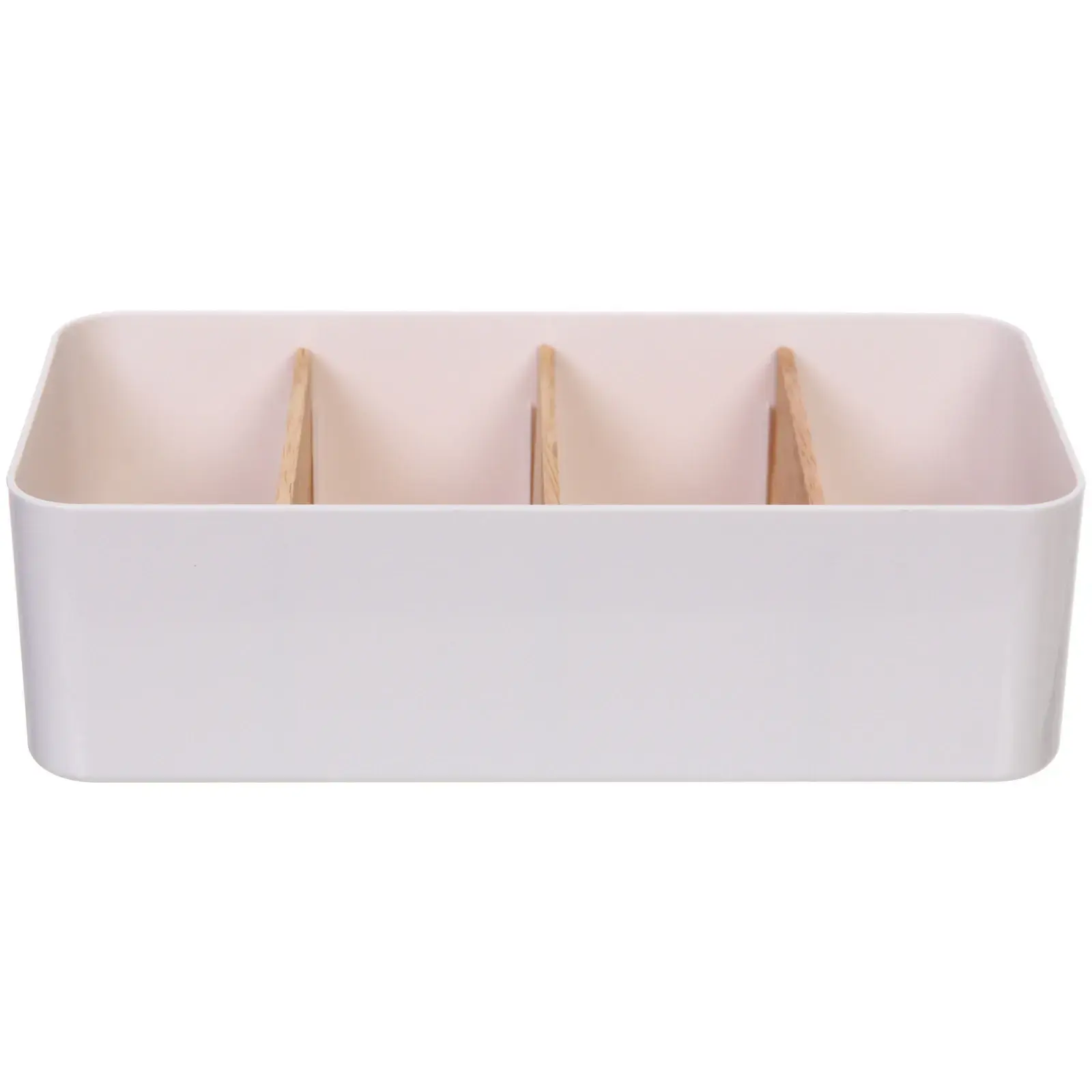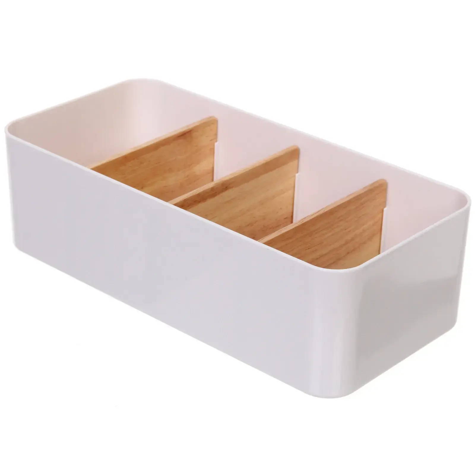 Этот органайзер идеально подходит для хранения канцелярских принадлежностей, косметики, мелких предметов и даже кухонных аксессуаров. Благодаря трем разделителям, выполненным из дерева, вы сможете удобно сортировать содержимое и быстро находить нужные вещи. Органайзер не имеет крышки, что делает его доступным и удобным в использовании.