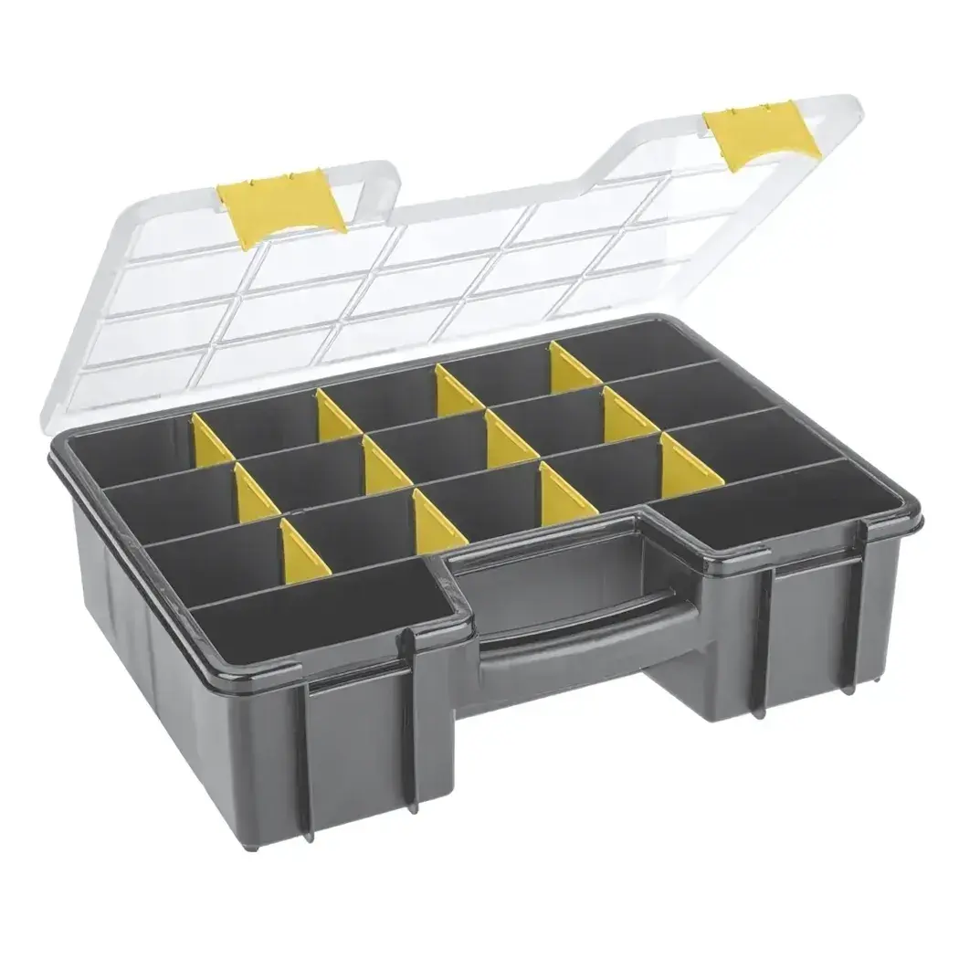Практичный органайзер с прозрачной крышкой сохранит порядок в мастерской и защитит содержимое от пыли. Идеален для хранения крепежа, мелких деталей и профессионального инструмента.