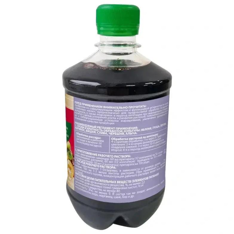 Объем упаковки составляет 0,45 литра, что позволяет вам удобно использовать продукт в течение сезона. Удобная пластиковая бутылка с зеленой крышкой обеспечивает легкость в использовании и хранении. На этикетке указаны все необходимые рекомендации по применению и состав удобрения, включая калиевые соли и аминокислоты, что гарантирует его эффективность.