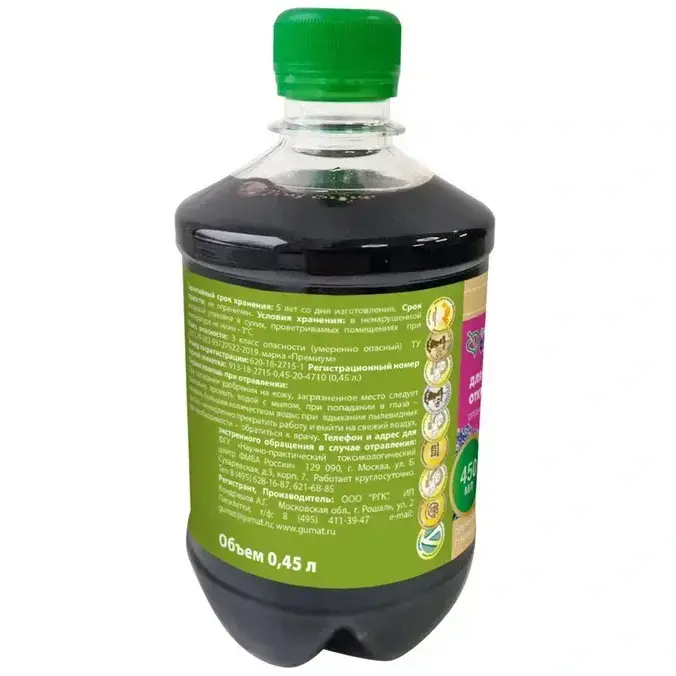 Объем упаковки составляет 0,45 литра, что позволяет вам удобно использовать удобрение в нужных количествах. Упаковка выполнена в черном цвете с зеленой крышкой, что делает ее стильной и привлекательной. На этикетке указаны все необходимые инструкции по применению, а также состав, включающий калиевые соли, органические кислоты, микроэлементы и аминокислоты.