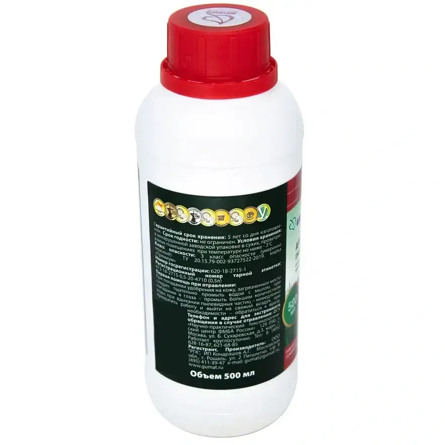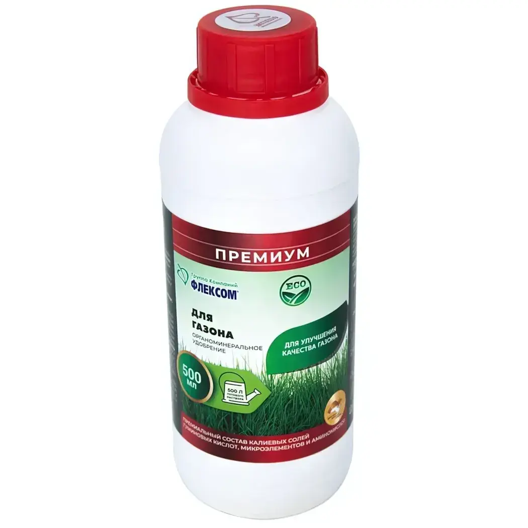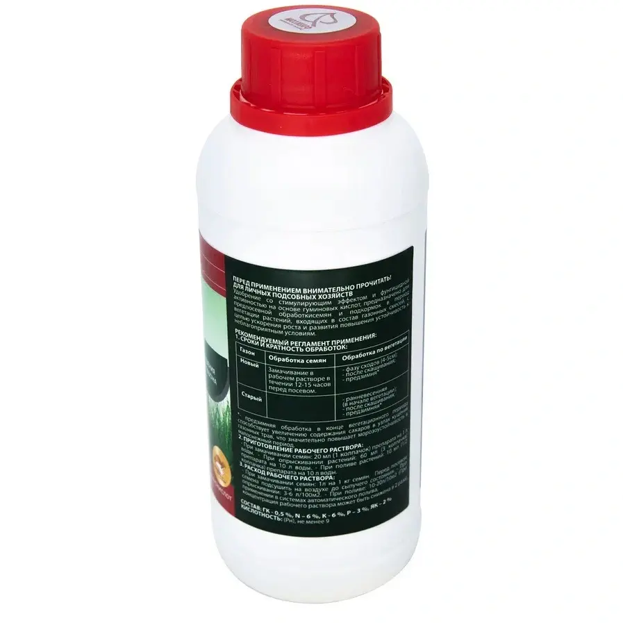 Объем упаковки составляет 500 мл, что позволяет удобно использовать удобрение на небольших участках. Упаковка выполнена в форме цилиндра с белым цветом и красной крышкой, что делает её легко узнаваемой. Удобрение содержит необходимые микроэлементы и аминокислоты, что обеспечивает комплексный подход к уходу за газоном.