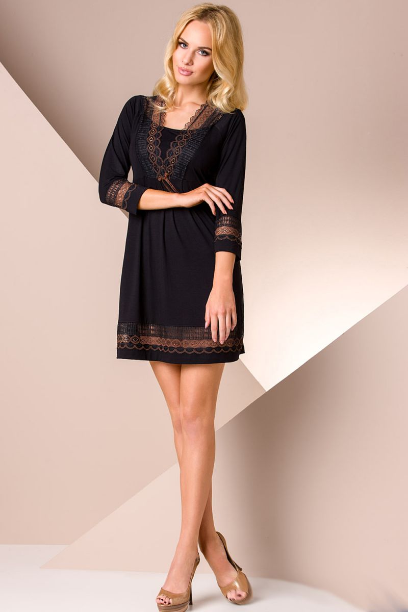 - Элегантный дизайн: V-образный вырез, низ изделия и рукава три четверти украшены контрастным кружевом коричневого или темно-бежевого оттенка, что добавляет образу изысканности и романтичности.