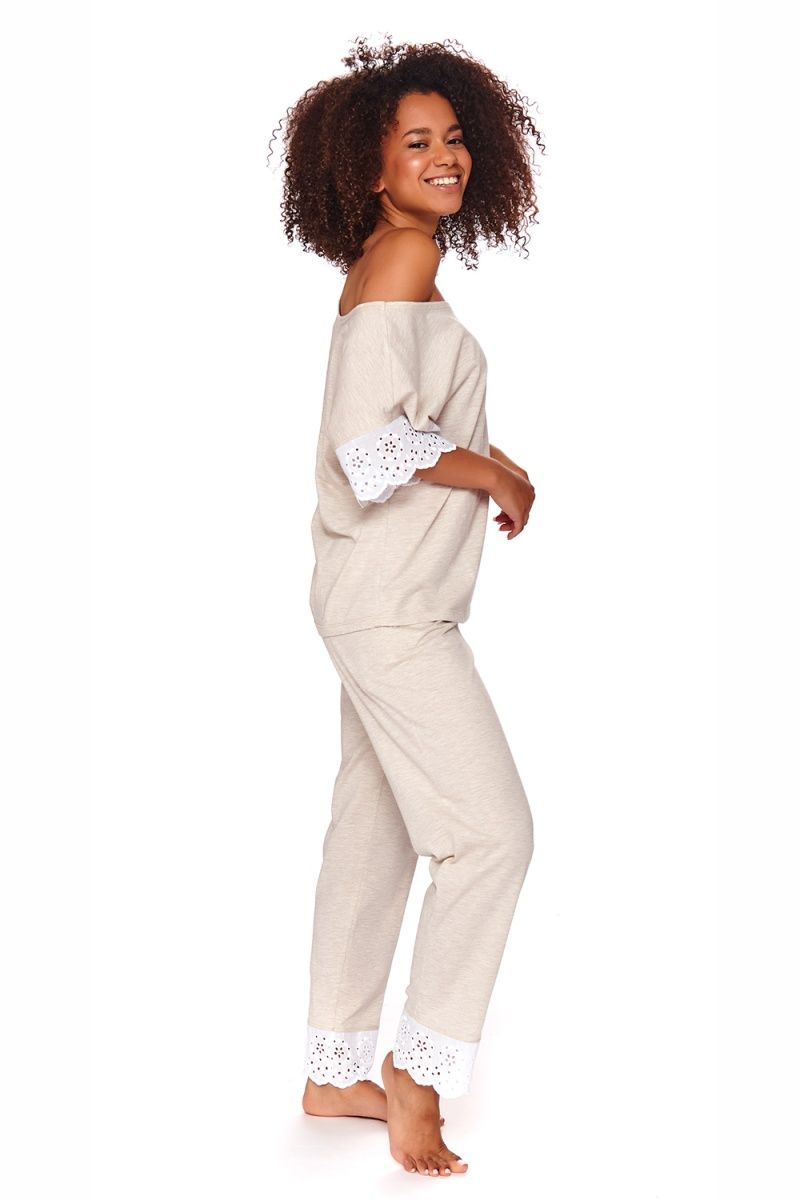 - Элегантная отделка: Белая кружевная отделка на рукавах футболки и манжетах брюк добавляет пижаме изысканности и романтичности, превращая обычную домашнюю одежду в стильный элемент гардероба.