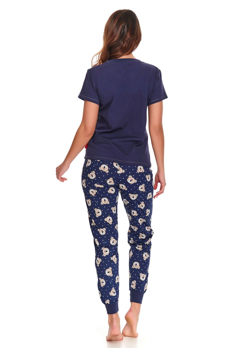 Пижама представлена в насыщенном темно-синем цвете, который отлично сочетается с контрастным светлым принтом. Крой размера L рассчитан на комфортную посадку. Изделие легко стирается и сохраняет форму и цвет после множества циклов стирки при соблюдении рекомендаций по уходу.