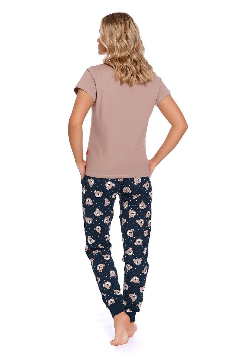 - Стильный дизайн: темно-синий цвет брюк с милым принтом бежевых медвежьих мордочек и белых точек создает игривое настроение