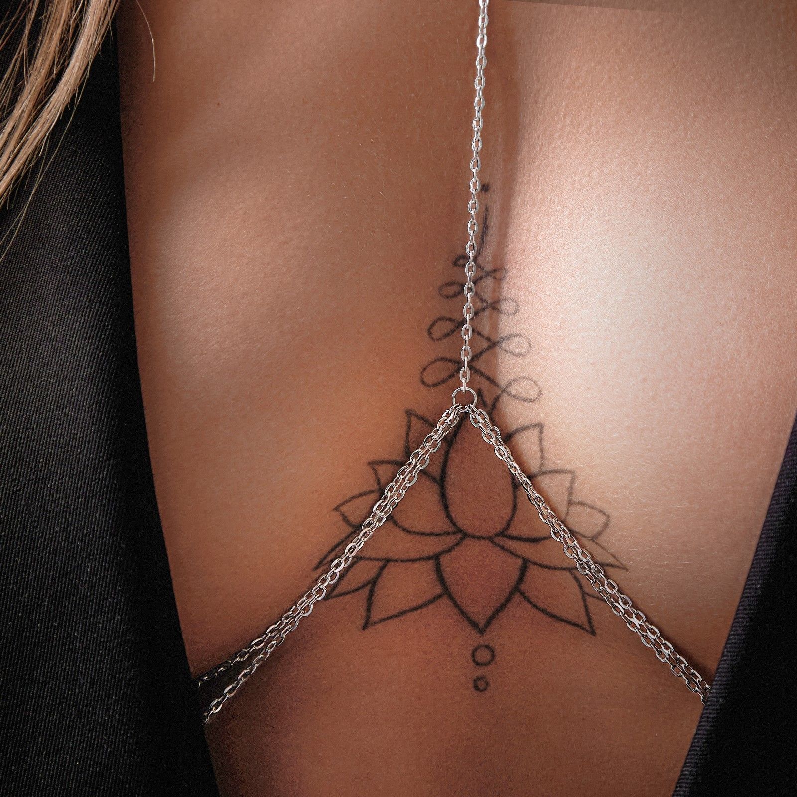 Цепочка эффектно смотрится с открытыми платьями, топами с глубоким вырезом или в качестве самостоятельного украшения. Может использоваться как самостоятельный аксессуар или в сочетании с другими украшениями в едином стиле.