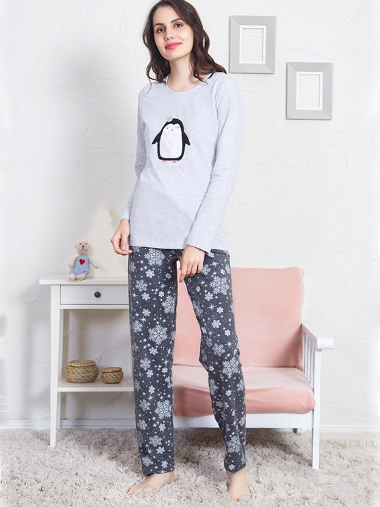 Пижама состоит из двух предметов: футболки с длинным рукавом и брюк. Футболка имеет круглый вырез, длинные рукава и украшена принтом с пингвином. Брюки прямого покроя декорированы рисунком снежинок по всей поверхности. Оба предмета выполнены в гармонирующих оттенках серого цвета, создавая стильный комплект.