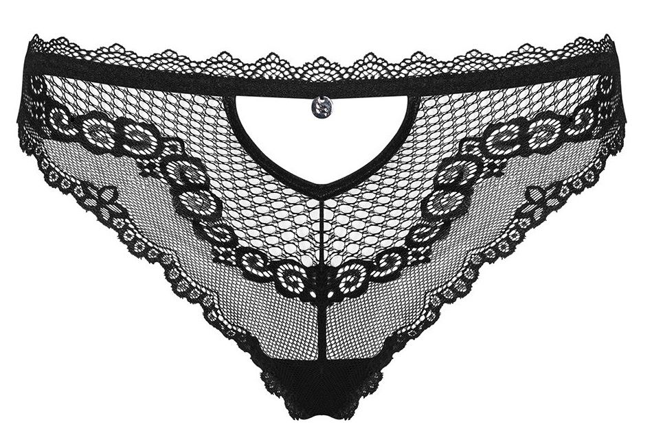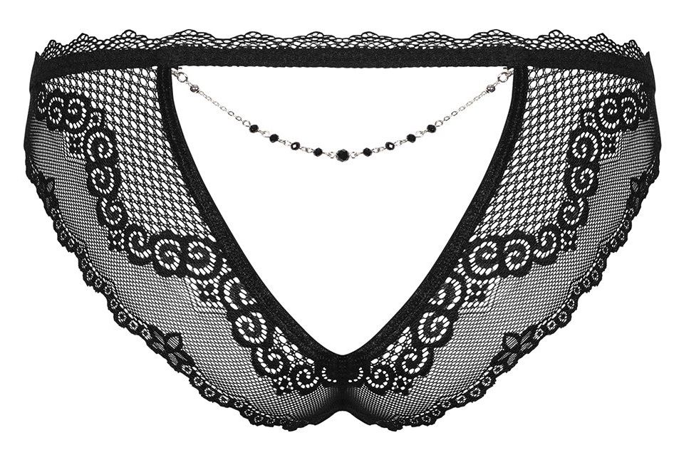Черные кружевные трусики с вырезами спереди и сзади подарят уверенность в себе и добавят остроты вечеру. Украшенные тонкой металлической цепочкой, они превращают обычное бельё в акцент образа.
