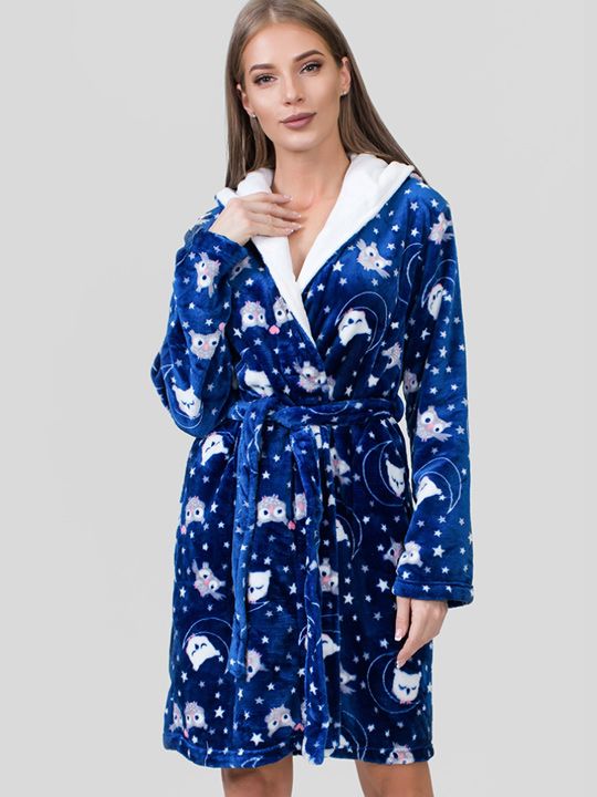 Темно-синий фон халата украшен милым рисунком с совами, звездами и луной. Этот детский, но стилизованный принт добавляет образу игривости и создает позитивное настроение. Белый воротник контрастно выделяется на основном фоне, делая модель более выразительной.