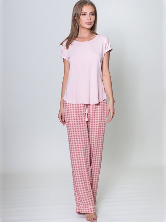 Комплект домашней одежды: футболка и прямые брюки в клетку, размер XL, цвет розовый, вискоза с эластаном