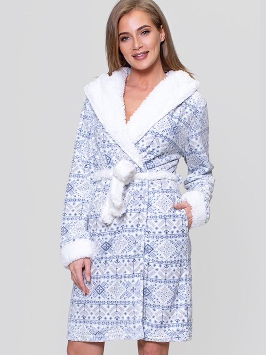 Особое внимание привлекает стильный дизайн: белая основа халата украшена современным голубым геометрическим узором. Воротник, манжеты и пояс контрастно выполнены из белого пушистого материала, что добавляет изделию визуальной привлекательности и дополнительного комфорта.