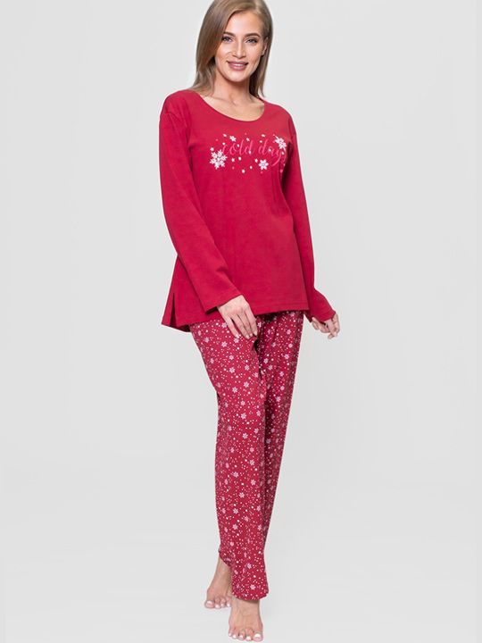 Футболка с длинным рукавом имеет круглый вырез и свободный крой, что обеспечивает максимальный комфорт при носке. Брюки прямого покроя с рисунком из снежинок дополняют образ и создают гармоничный ансамбль. Комплект представлен в насыщенном бордовом цвете, который хорошо сочетается с различными оттенками в интерьере.